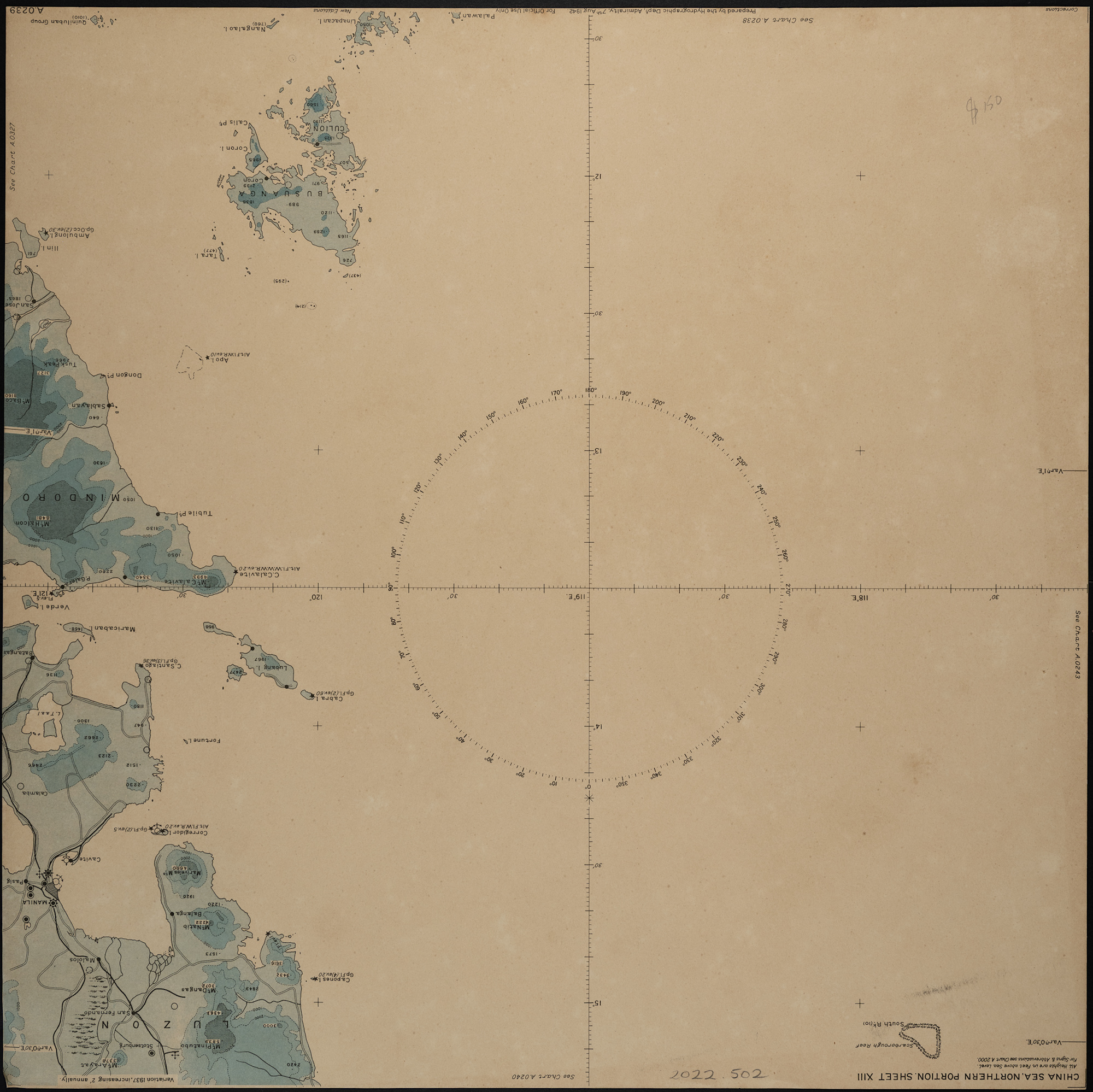 - Black ink drawing on the back of vintage sea chart