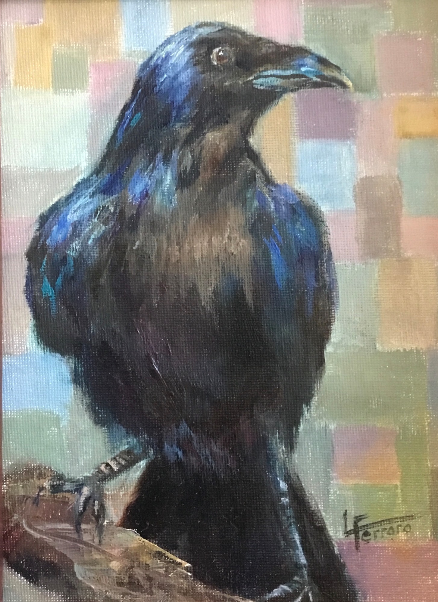 Titled Crowma, this painting mixes the mysterious vibe of a crow with a vibrant, multicolored background. It’s a playful nod to the term "chroma," blending the bird's dark silhouette with bursts of color. The contrast really makes the crow stand out, creating a dynamic, eye-catching piece.