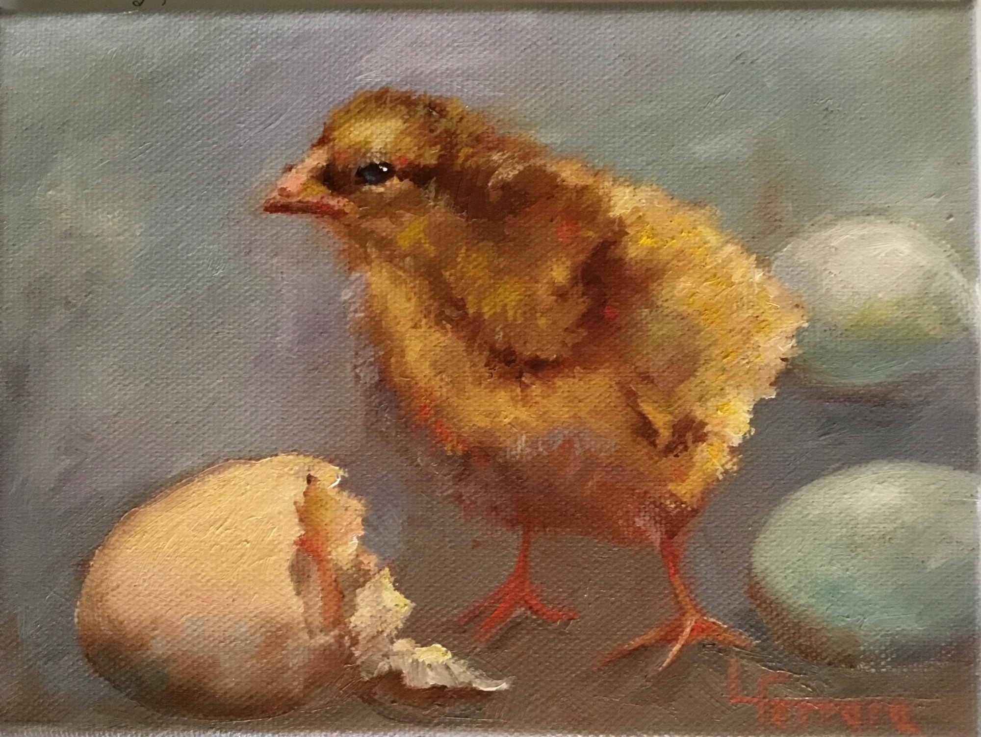 This painting features baby chicks from the incubator at the PA Farm Show. I swapped out the plain wire pen for a more engaging background, focusing on the chicks' adorable fluffiness. It’s all about bringing their lively energy and cuteness to the forefront in a more vibrant setting.