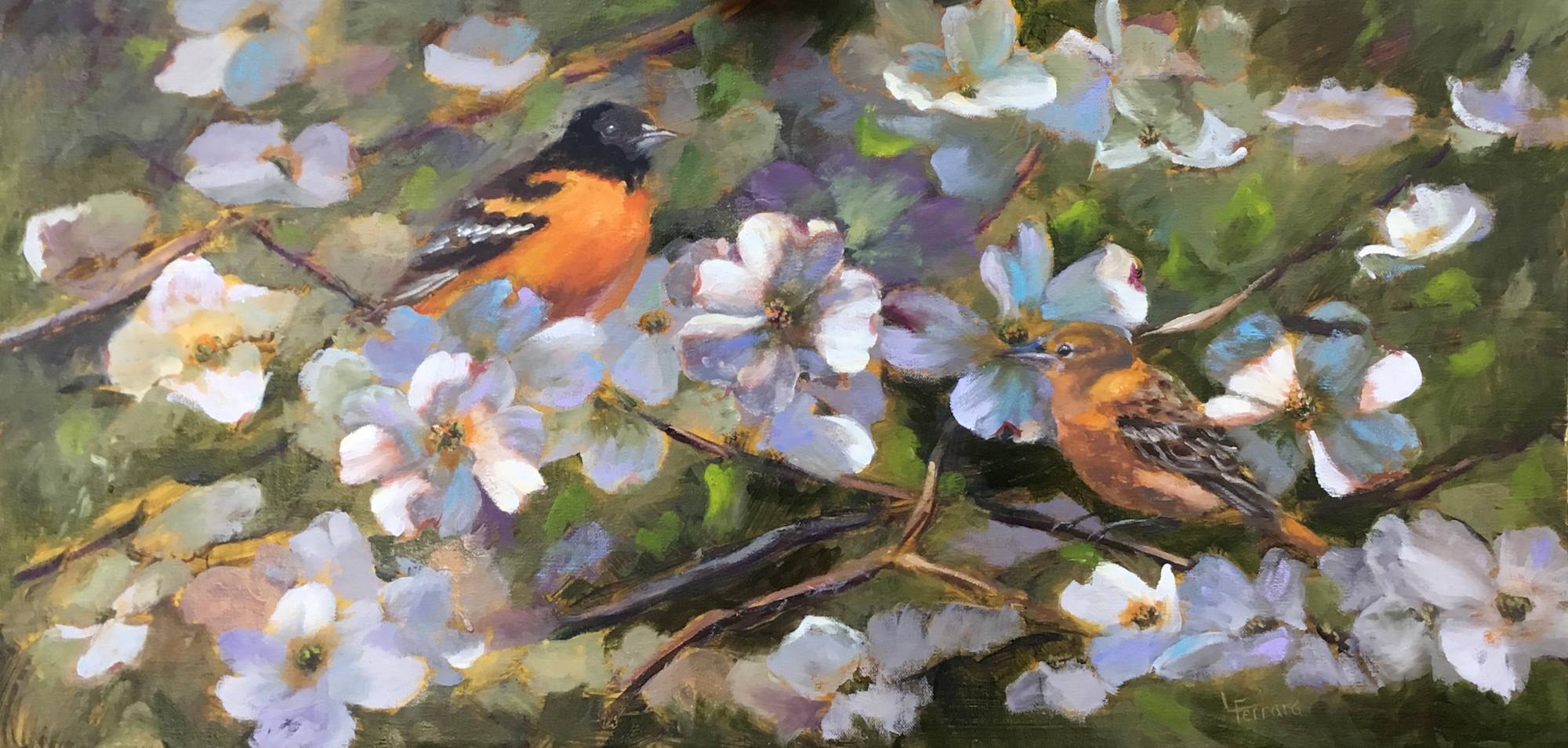 This work captures the vibrant energy of a pair of Baltimore Orioles perched among the blooms of a flowering dogwood tree. The painting's realistic details showcase the orioles' brilliant orange plumage contrasted against the soft whites and pinks of the blossoms. Dappled sunlight filters through the leaves, creating a play of light and shadow that adds depth and atmosphere, inviting viewers into a serene moment of nature’s beauty.