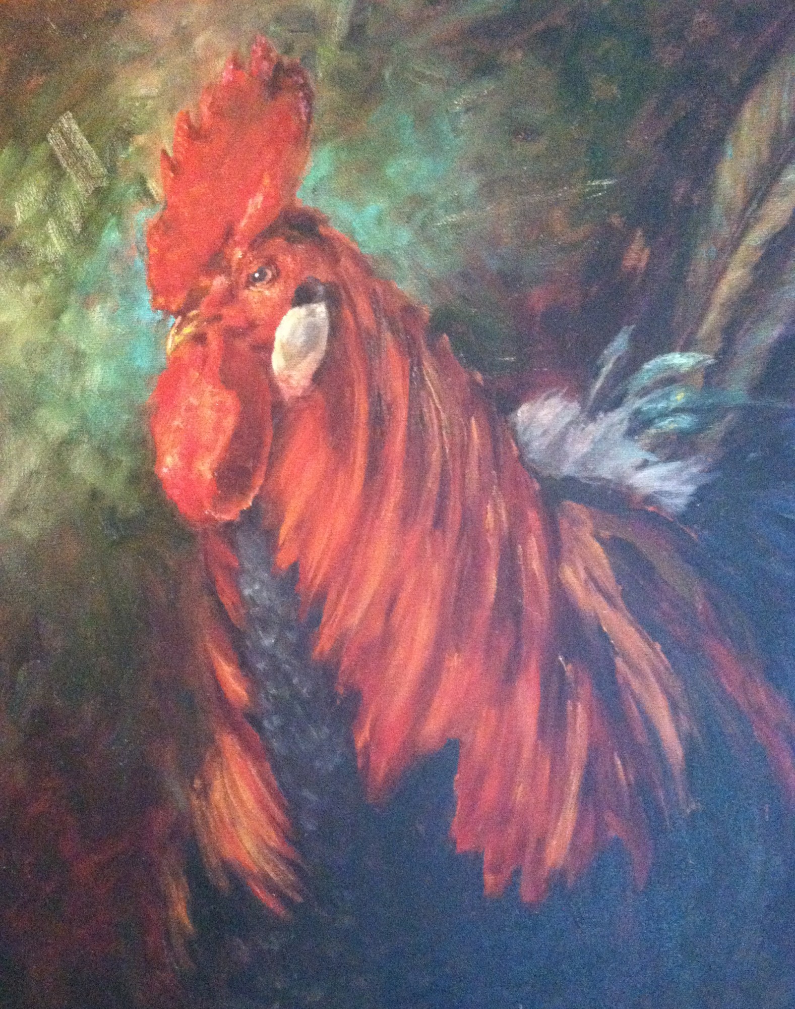 For this painting, I opted for a portrait-style background to highlight the rooster. I had a blast adding vibrant colors behind him, making sure the rooster’s bold presence really stands out. The contrasting background adds depth and energy, enhancing the overall dynamic of the piece.