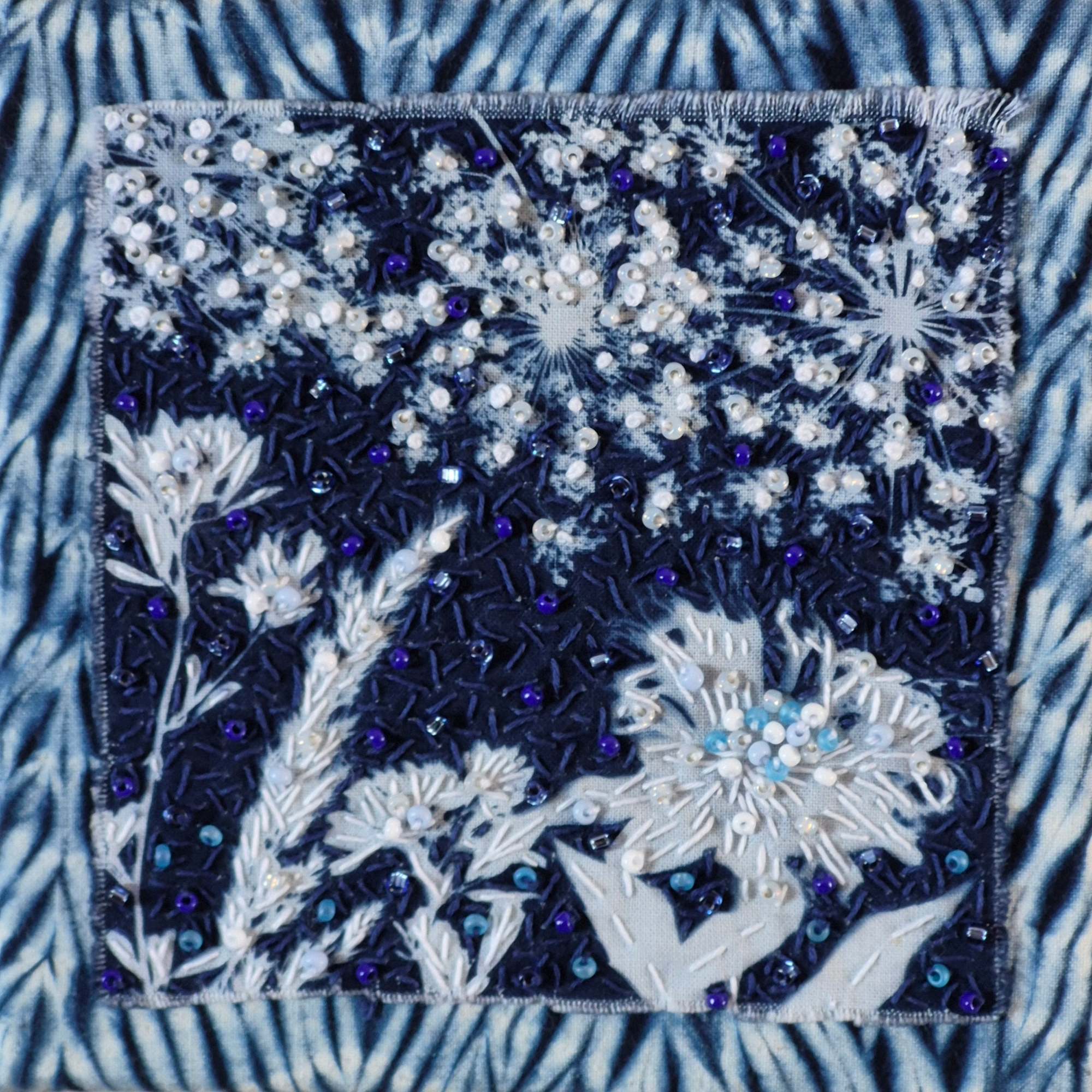 This piece started as a 5x5 cyanotype on cloth. I made the cyanotype using sprays of goldenrod. After stitching, mounting, and adding beads, I stretched it over a 6x6 canvas.