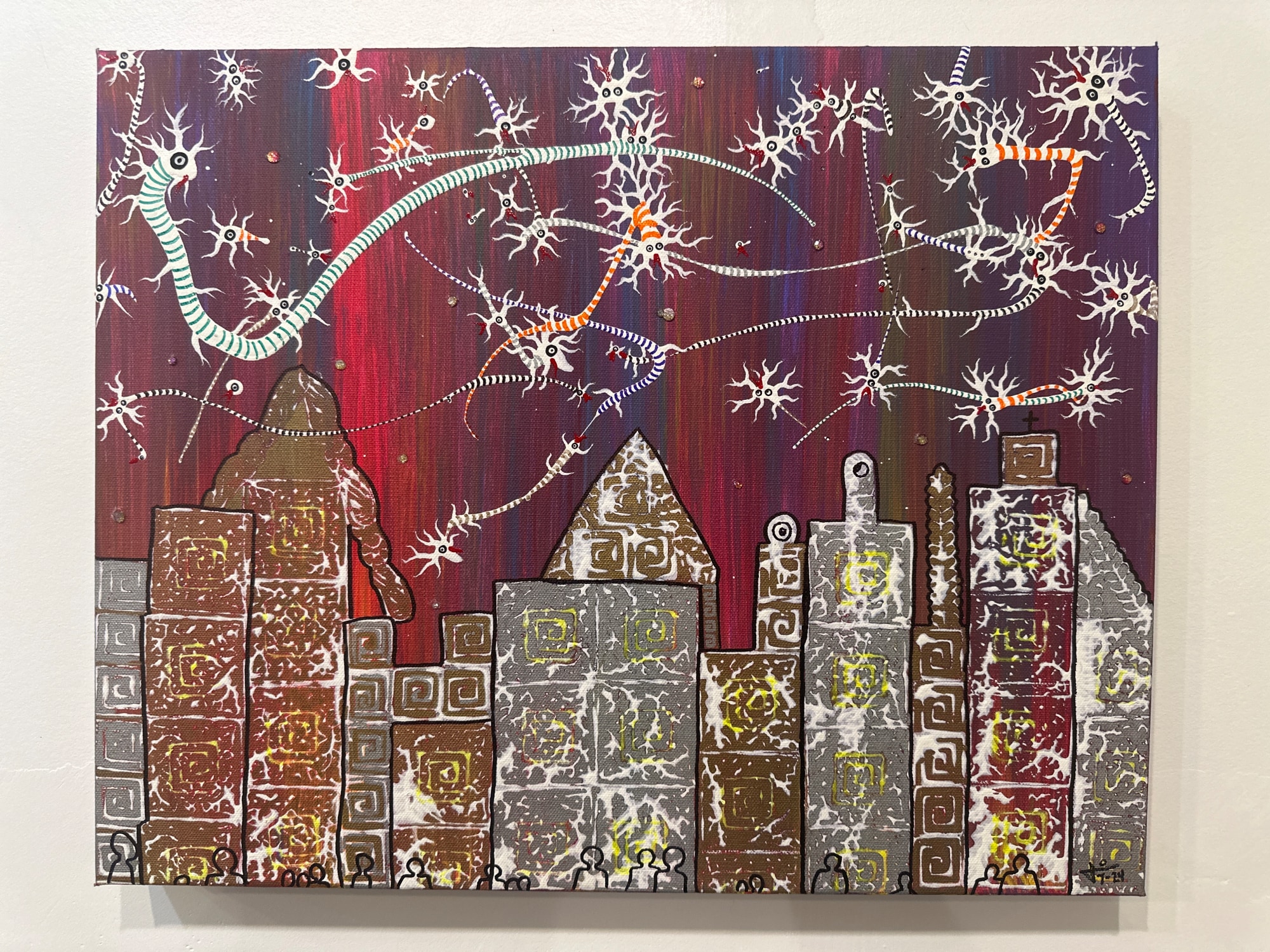 Acrylic, rhinestones, marker on canvas