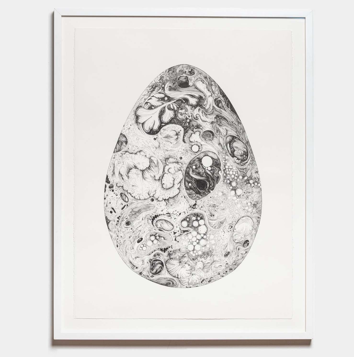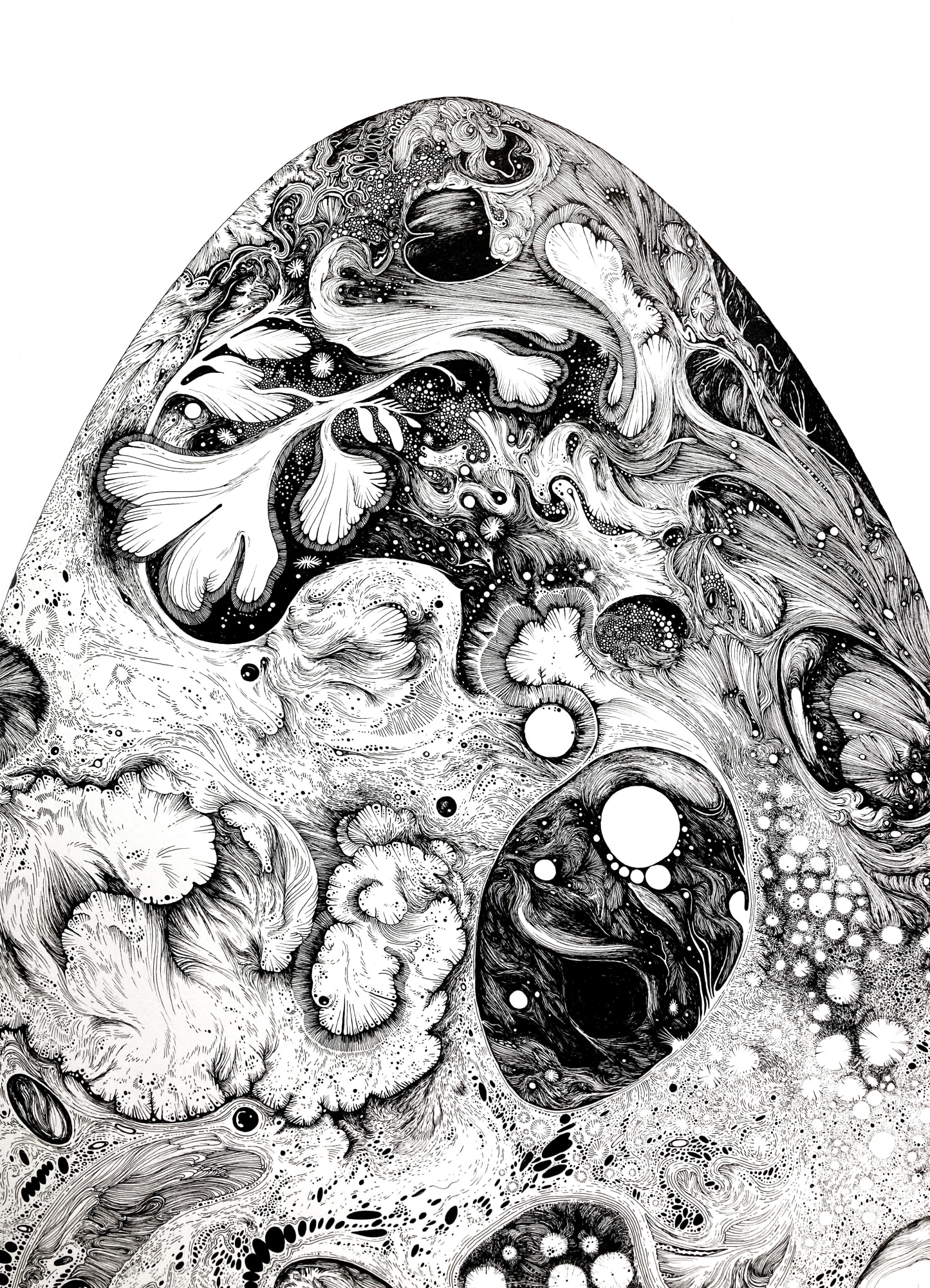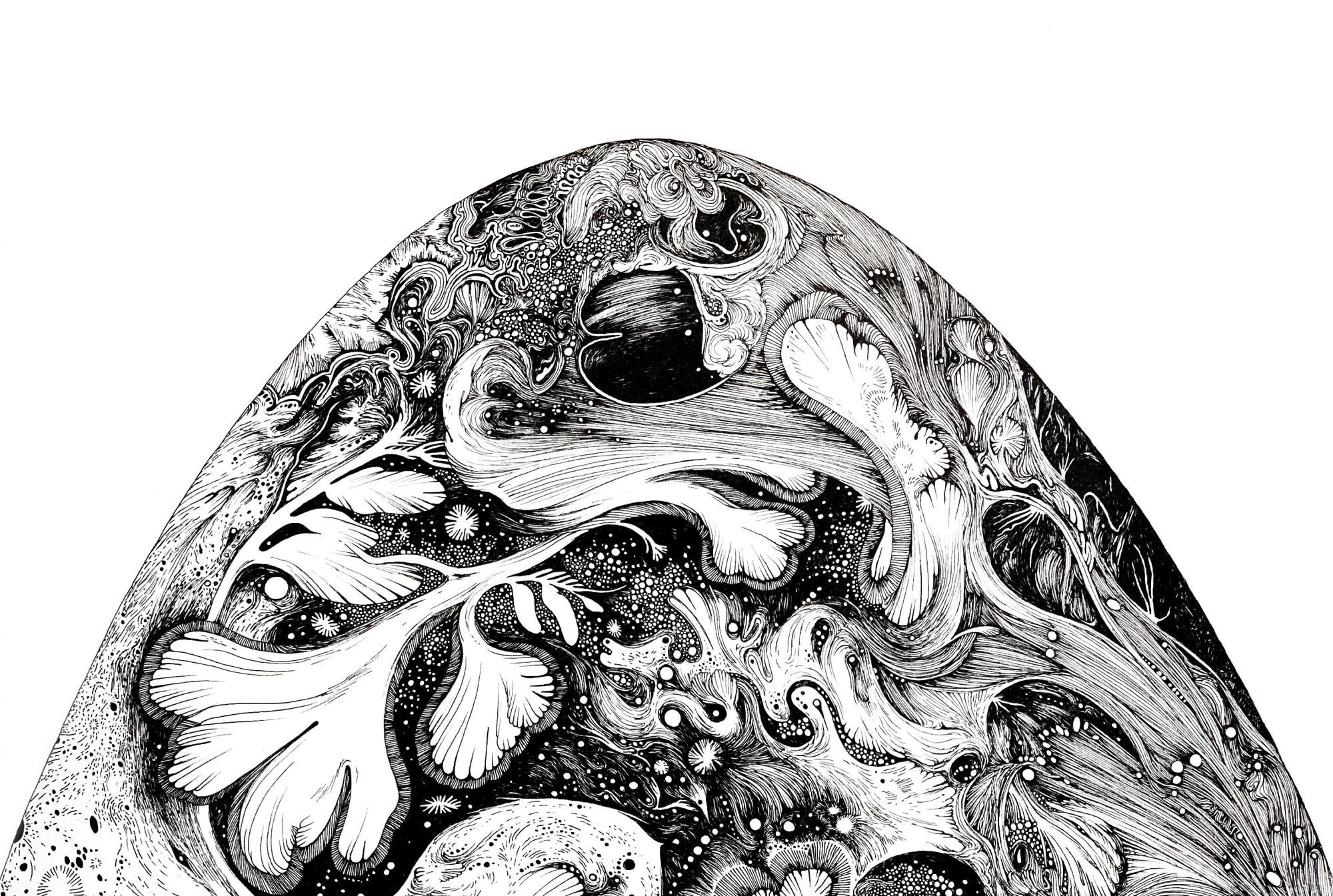 In November of 2023, I embarked on a forty hour journey of self doubt and discoveries. A clean outline in the shape of a giant egg, a few lines on pencil as a general direction for composition. And off it went. It’s pen and ink so theres no room for mistakes, because…there is no “mistake”. Whatever happened on the page, “good” or “bad”, is here to stay. The black lines and white negative spaces are engaging in a dialogue, leaving space for each other to exist. While drawing, I think about “the life” of the line. does it allow a path for other lines to begin and to end? Some people noticed that the lines don’t ever cross…no they don’t. They merge, complete each other, add to one another, into a lace-like pattern. Maybe they are too well-behaved.. but that’s how I like it. All moving together side by side, like a school of fish or a murmuration of starlings (thank you to my dear Margie Criner for the word).