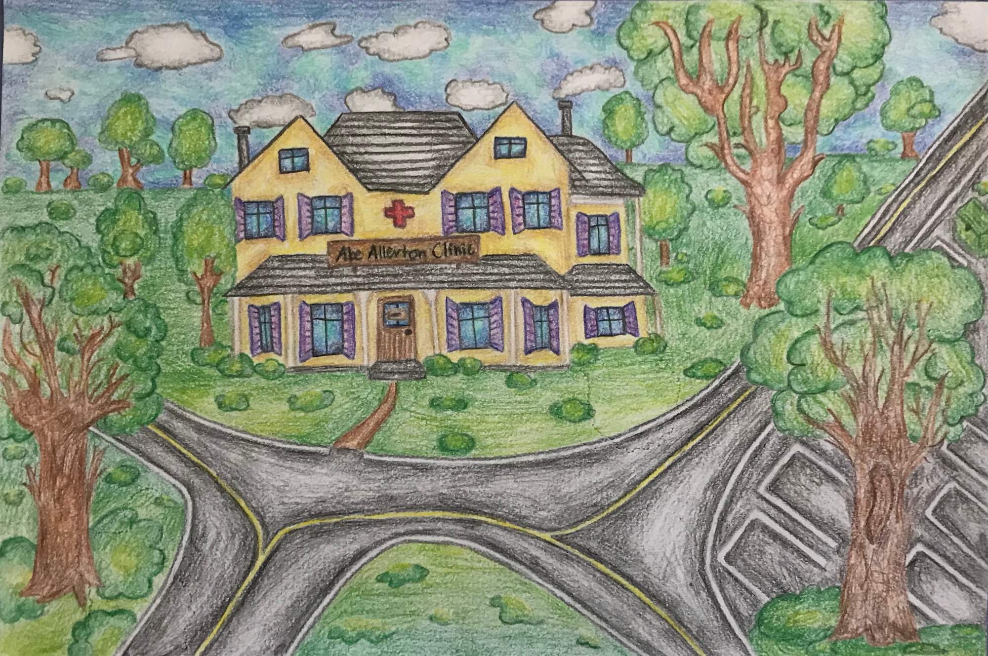 Imagined postcard illustration of Abe Alberton’s clinic, inspired by Elatsoe by Darcie Little Badger.