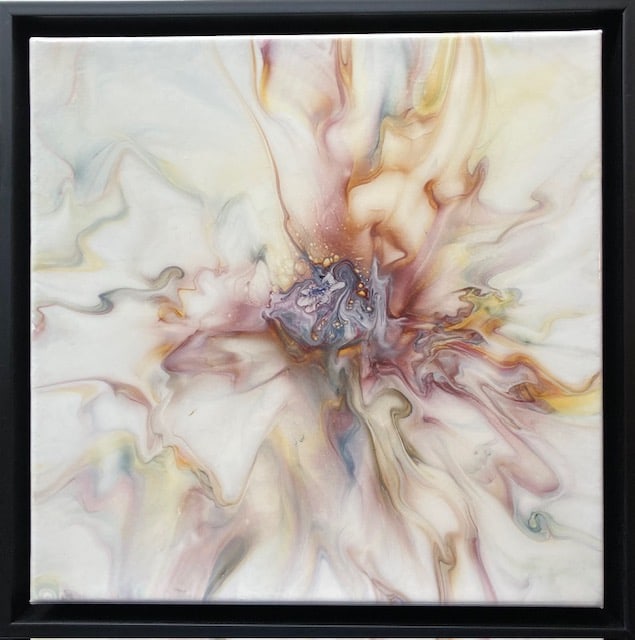 Shimmers of golds, whites and burgundy...so soft and light that you find yourself mesmerized. Is it possible to have form with no clear definition? That's the mystery within this magical piece. Completed with a varnish finish and a black frame.