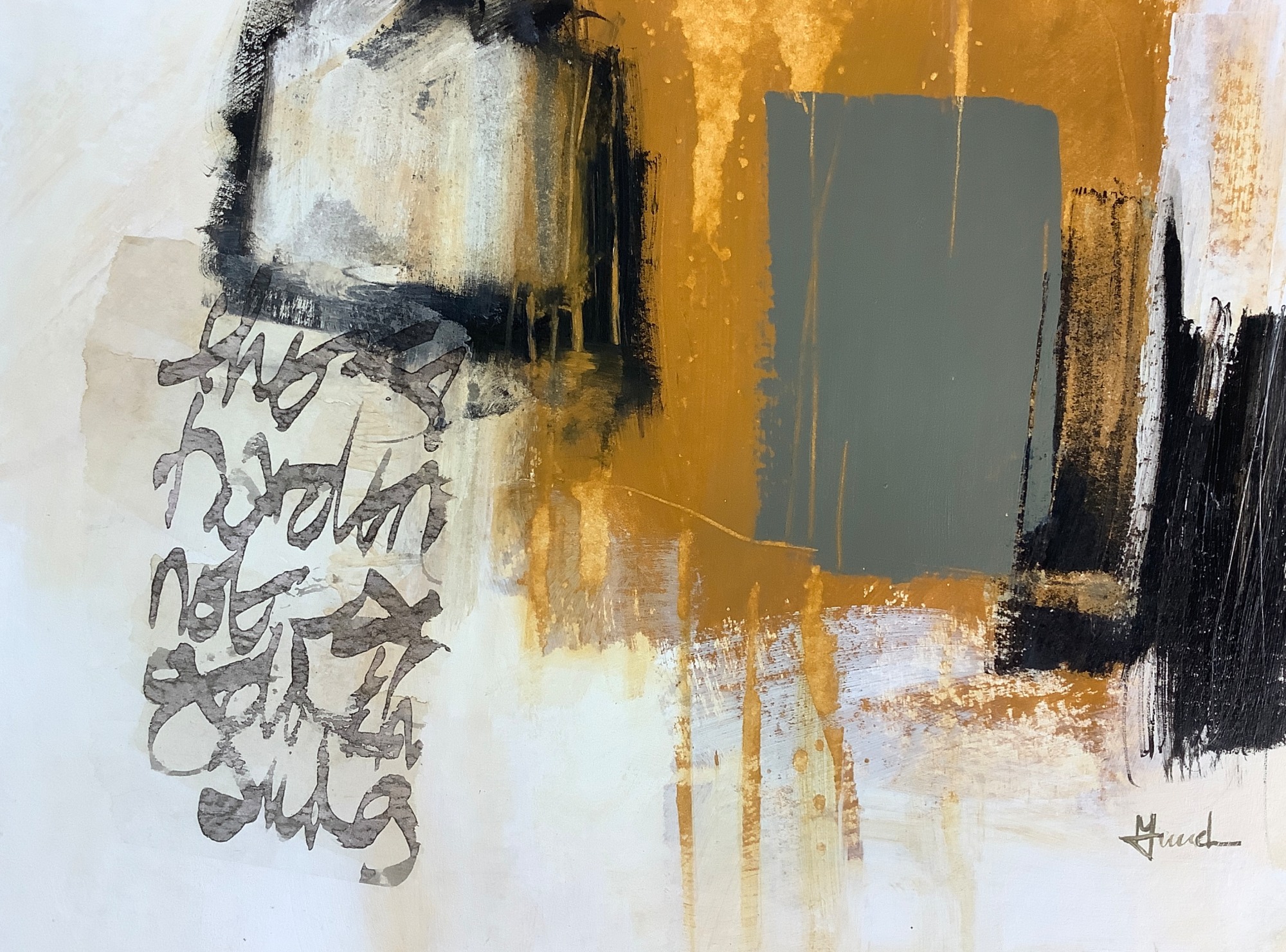 Expressive abstract landscape inspired by sunlight on the landscape. Painted in yellow, grey, black and white, in acrylic paint and ink calligraphy collaged onto watercolour paper.