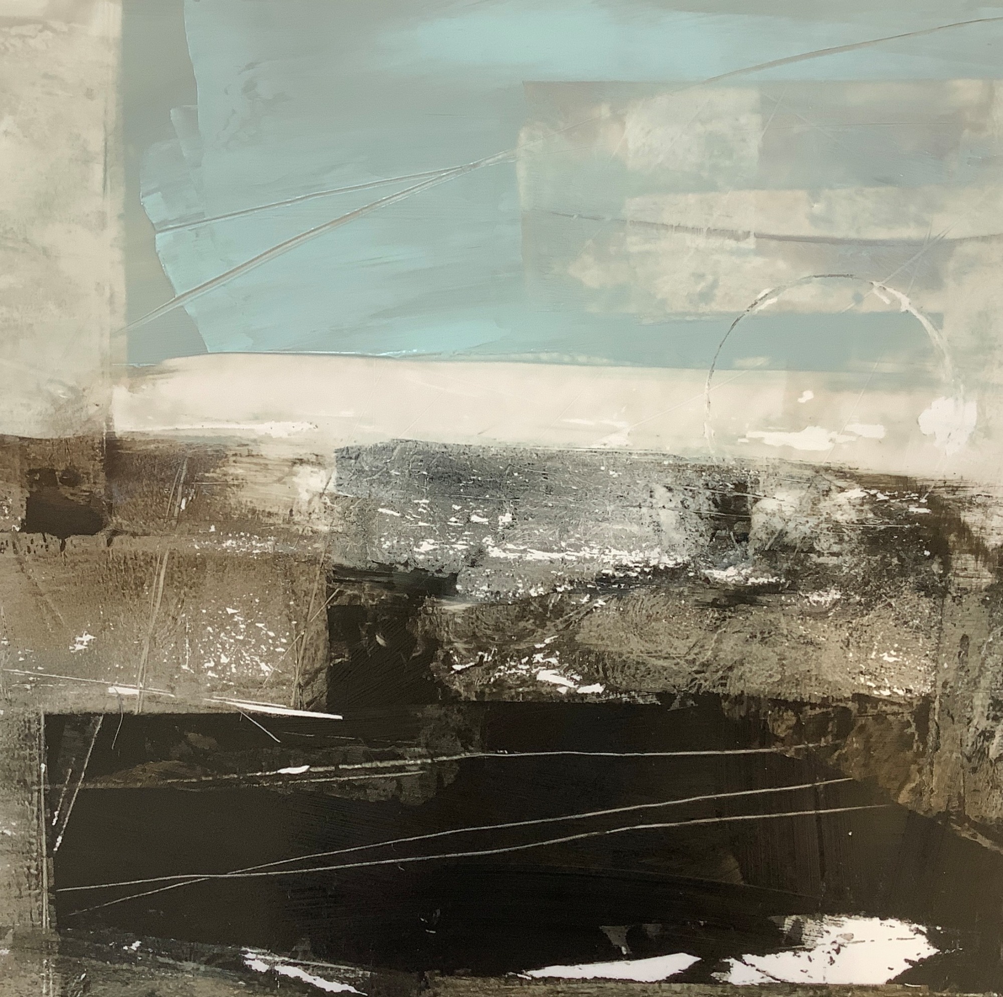 Evoking the sense of passing through a landscape, and of moving through time. ‘In passing’ is part of my ‘Journeys’ series. This atmospheric piece is painted in acrylics on Duralar, a semi-opaque drafting film which gives a subtle extra dimension to the painting.