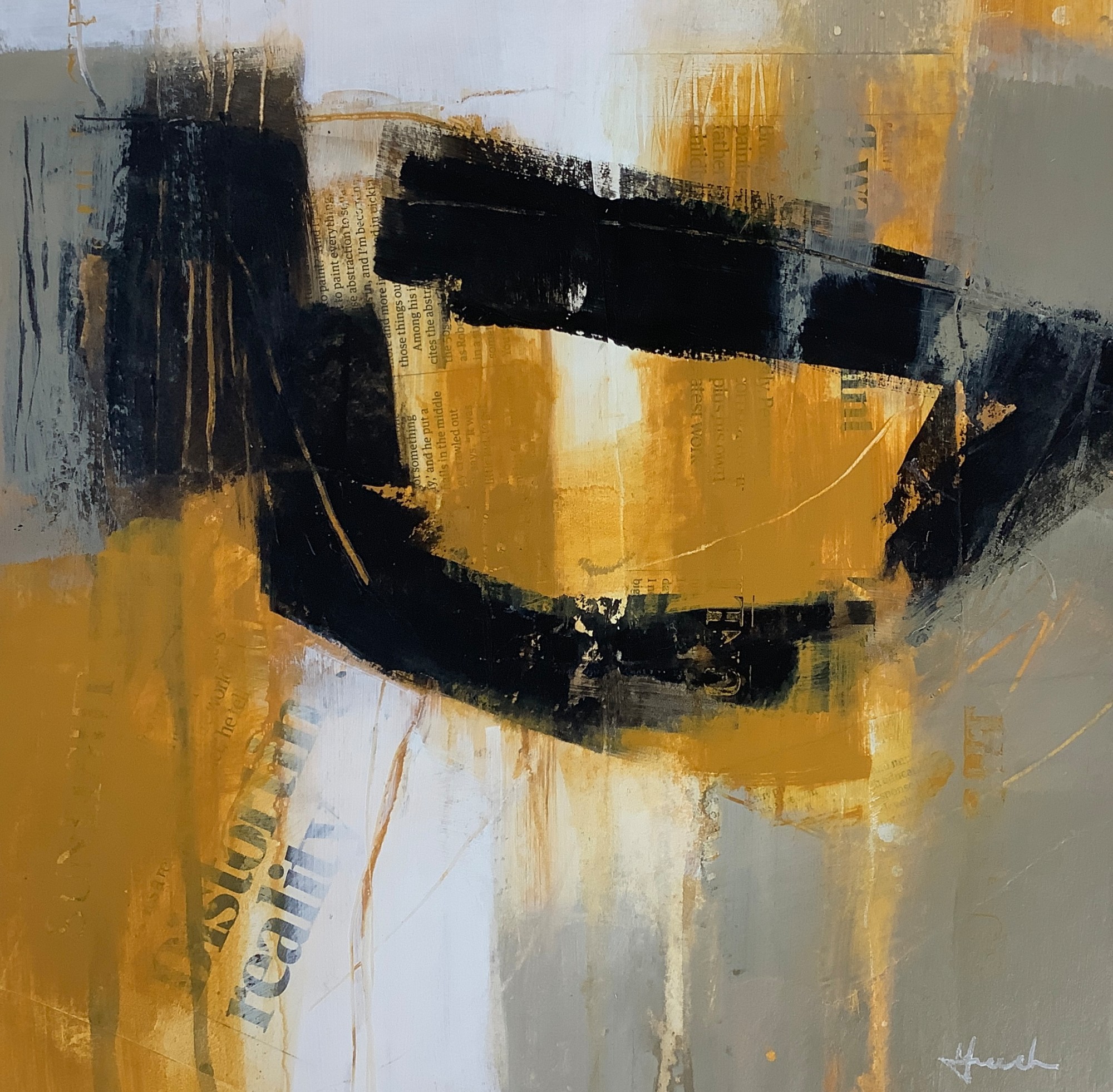 Expressive abstract landscape inspired by sunlight on reedbed pools. Painted in yellow, grey, black and white, in acrylic paint and newsprint on watercolour paper.