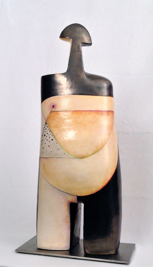 Message"Inner Dialogue" has glazed and mixed media surfaces and is mounted on a stainless steel base.