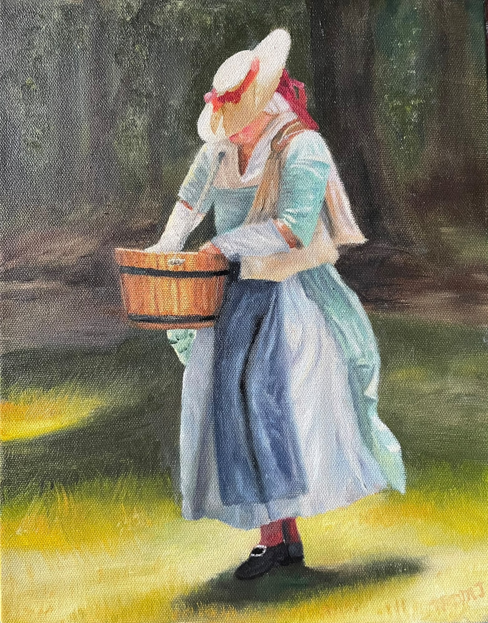 Took a photo of this reenactor and loved the light on her BUT she moved out of the frame and the top of the hat was cut off. Perfect solution, paint the photograph and include the entire hat. It was fun painting in the highlights and shadows.