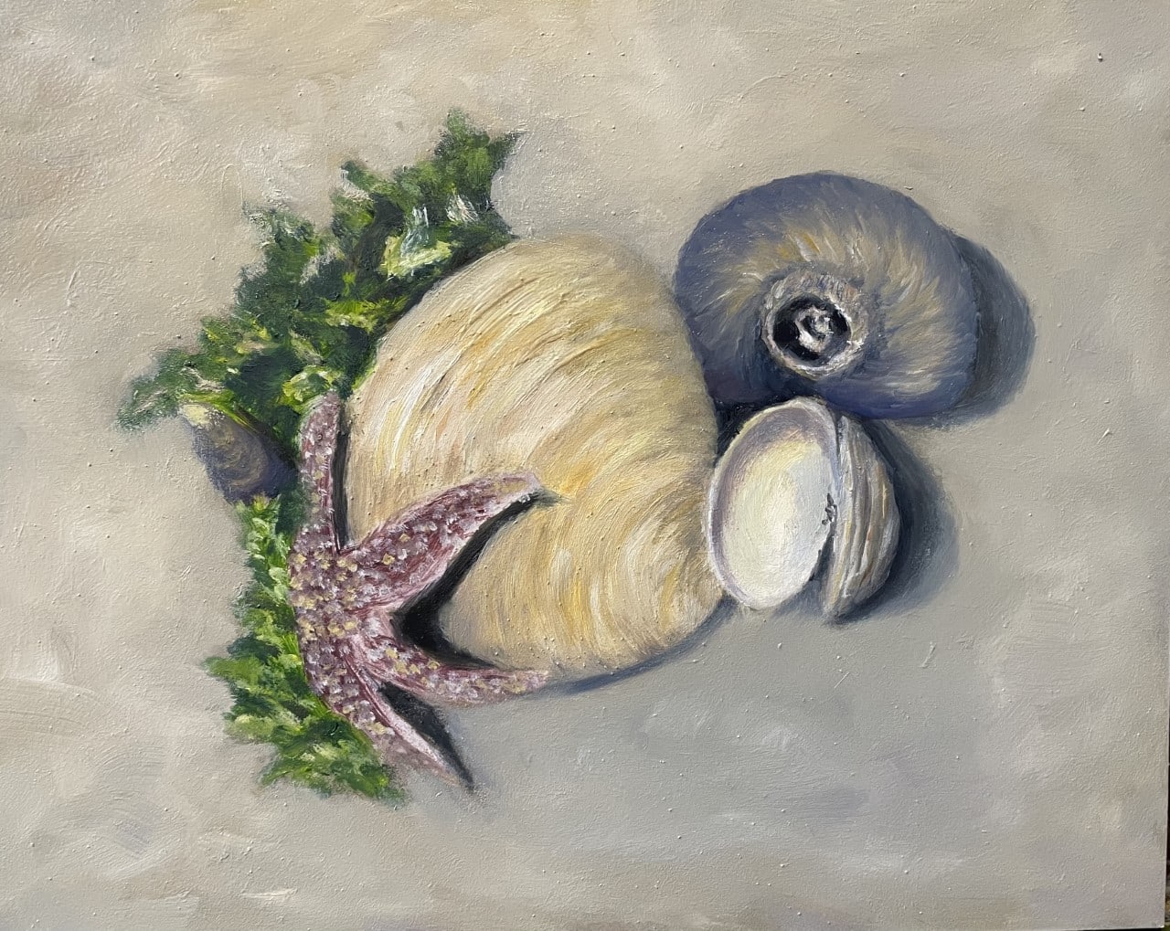 During a Plein Aire Class at the beach, this wonderful arrangment of shells and other treasures from the sea was right at my feet. Laid out the painting that day and finished the details at a later date.