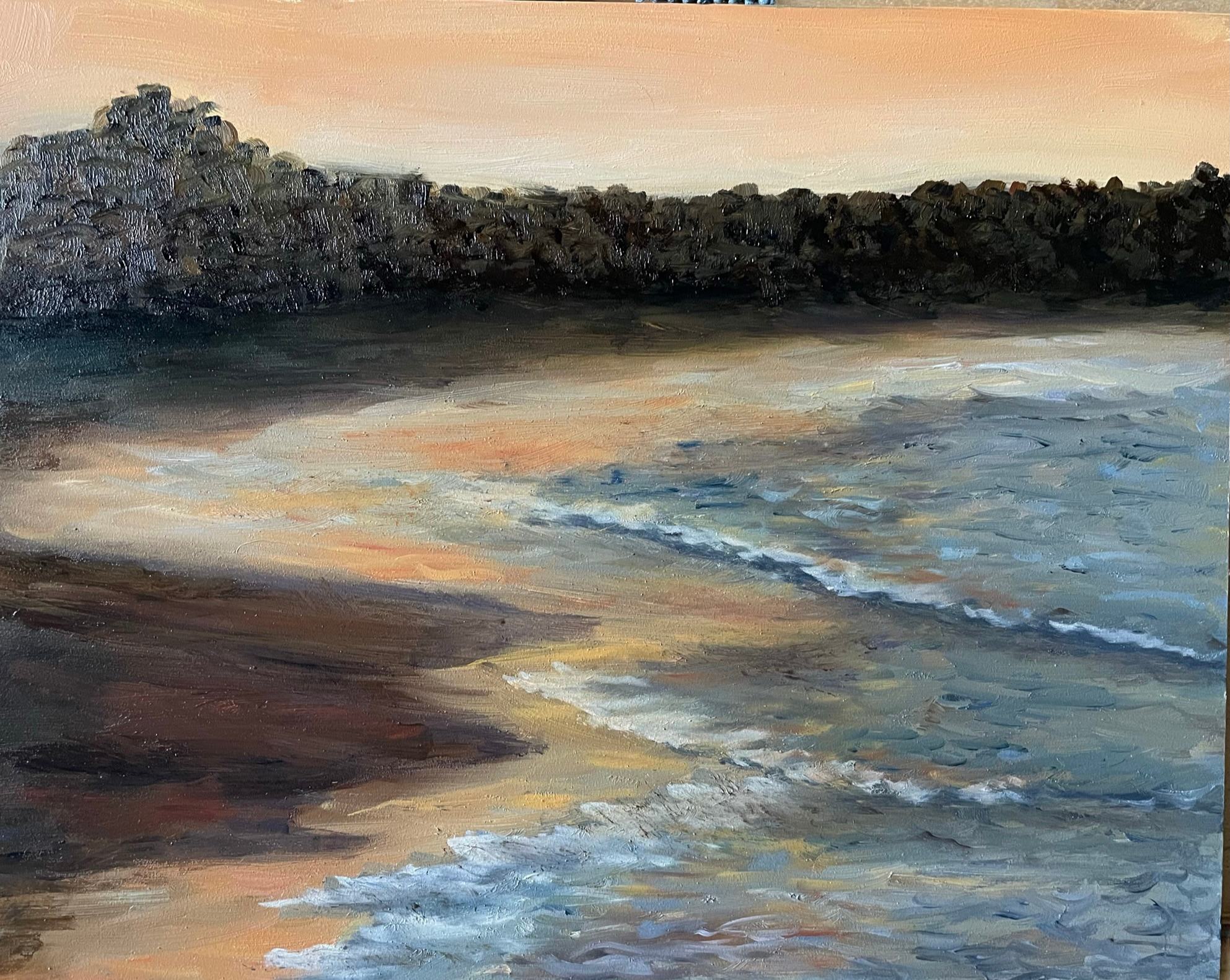 Sandy Hook has changed since I took the photo used for this painting. There used to be a spot where the sunset over the river side dunes that produced a wonderful light across the water. While it is somewhat still there, it is not as spectacular as before. But the changes also produced new exciting configurations. This day, the setting sun produced a golden shoreline of the wet sand while the water remained dark with a blueish tinge. The sand was a warm brown which with the sunset colors gives an overall warm feeling to the painting.