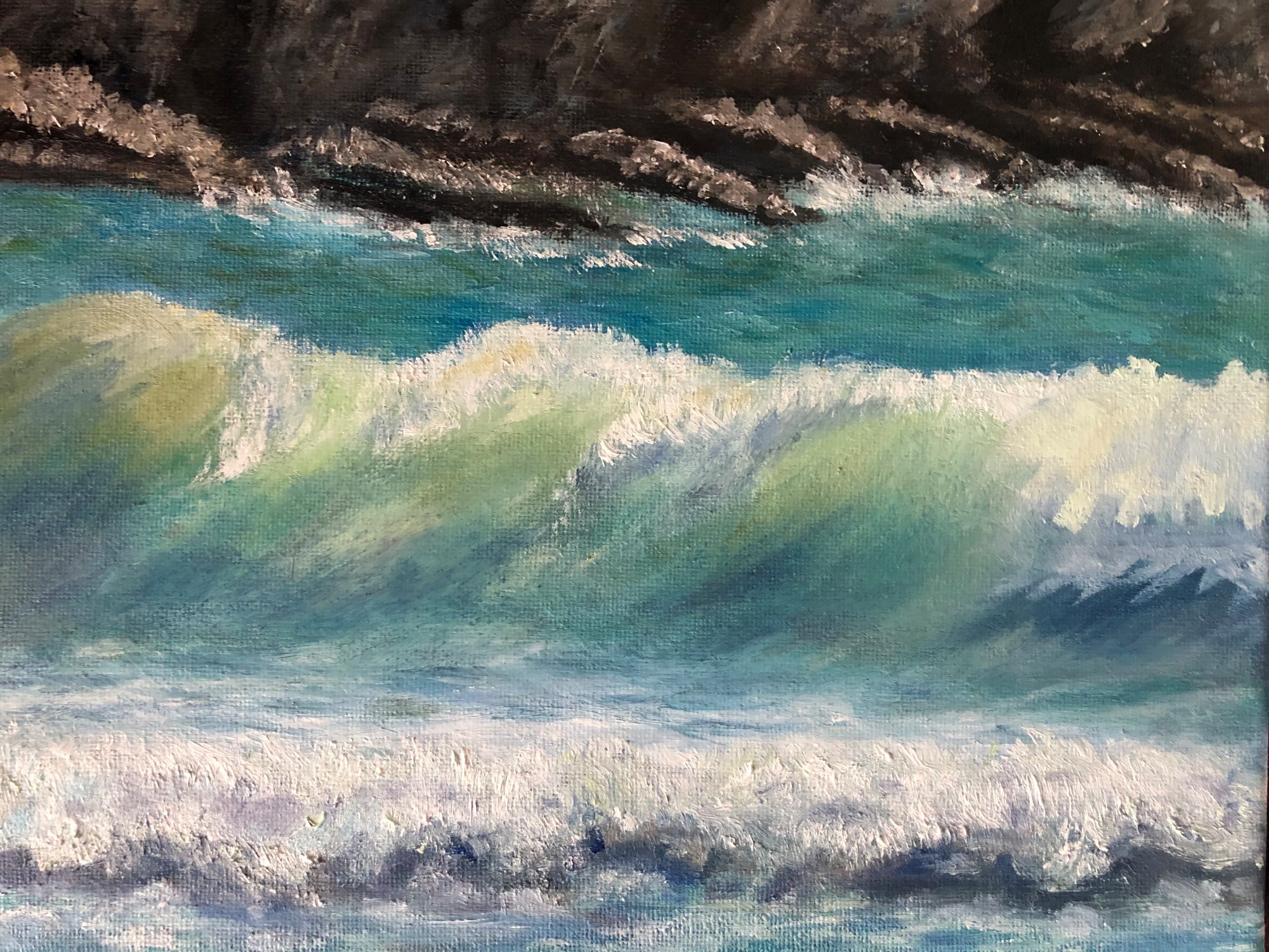 This painting is based on a photo I took on Sherkin Island, Ireland. We had the most gorgeouse day. The sun coming through the waves produced the loveliest green/yellow color which constrasted nicely with the turquiose color water and dark water colors.
