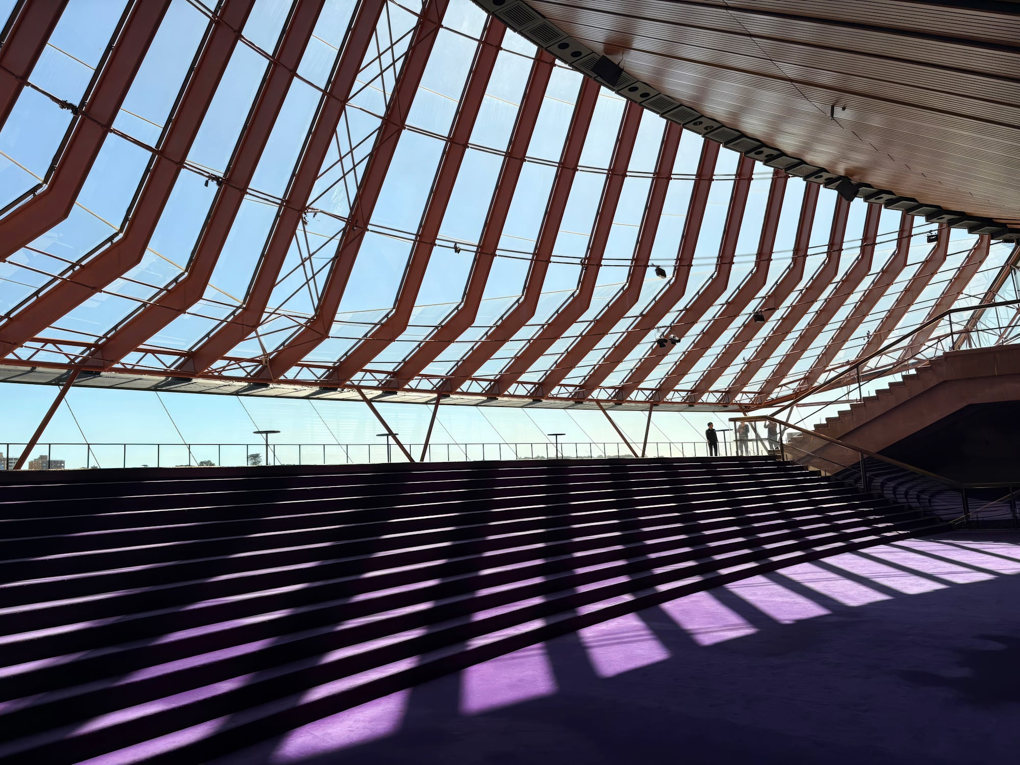 During a tour of the Sydney Opera house, this beautiful image presented itself. The guide was talking about something that was behind this image but I was lost in the play of the light and lines. There a pleasing symmetry to the arc of the shadows and light.