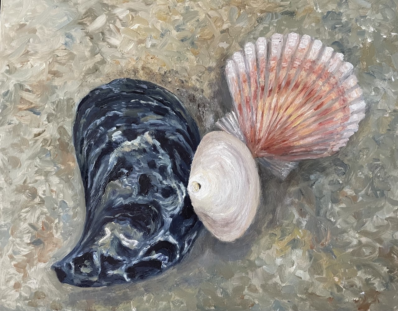 When painting or photographing a groups of shells and beach remains, almost always, the configuration is the way nature deposited the items on the beach. For this particular painting, there were 3 shells right next to each other an oyster, scallop and a small white clam. Loved the configuration so decided to paint the shells.