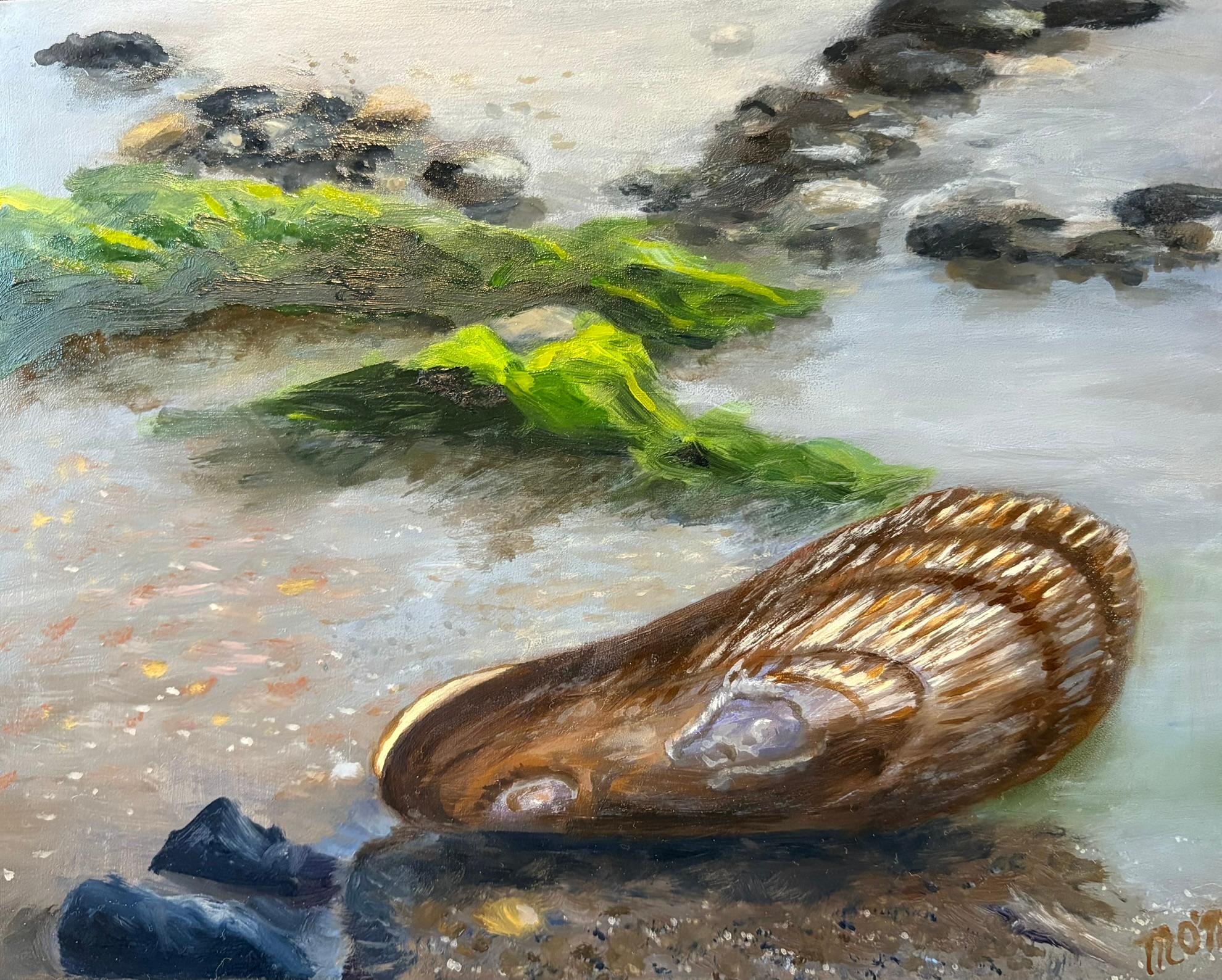 The ribbed mussels are visible at low tide in many areas. At first glance, they are not the most attractive shells but when they start to breakdown, you can see all the layers, many of which are a purpliest in hue. This day the light was amazing, lighting up the seaweed behind the shell and creating dramatic highlights and shadows.