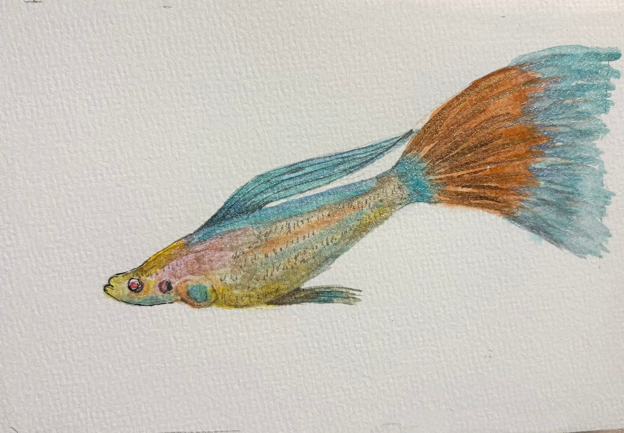 While recovering for a medical procedure, it was uncomfortable to oil paint at an easal or to paint larger watercolor paintings. I had recently purchased some metallic watercolor paints thought fish would be the perfect subject to test them out on. Very pleased with the way may of them turned out. Framed and Matted $65 - Unframed $50