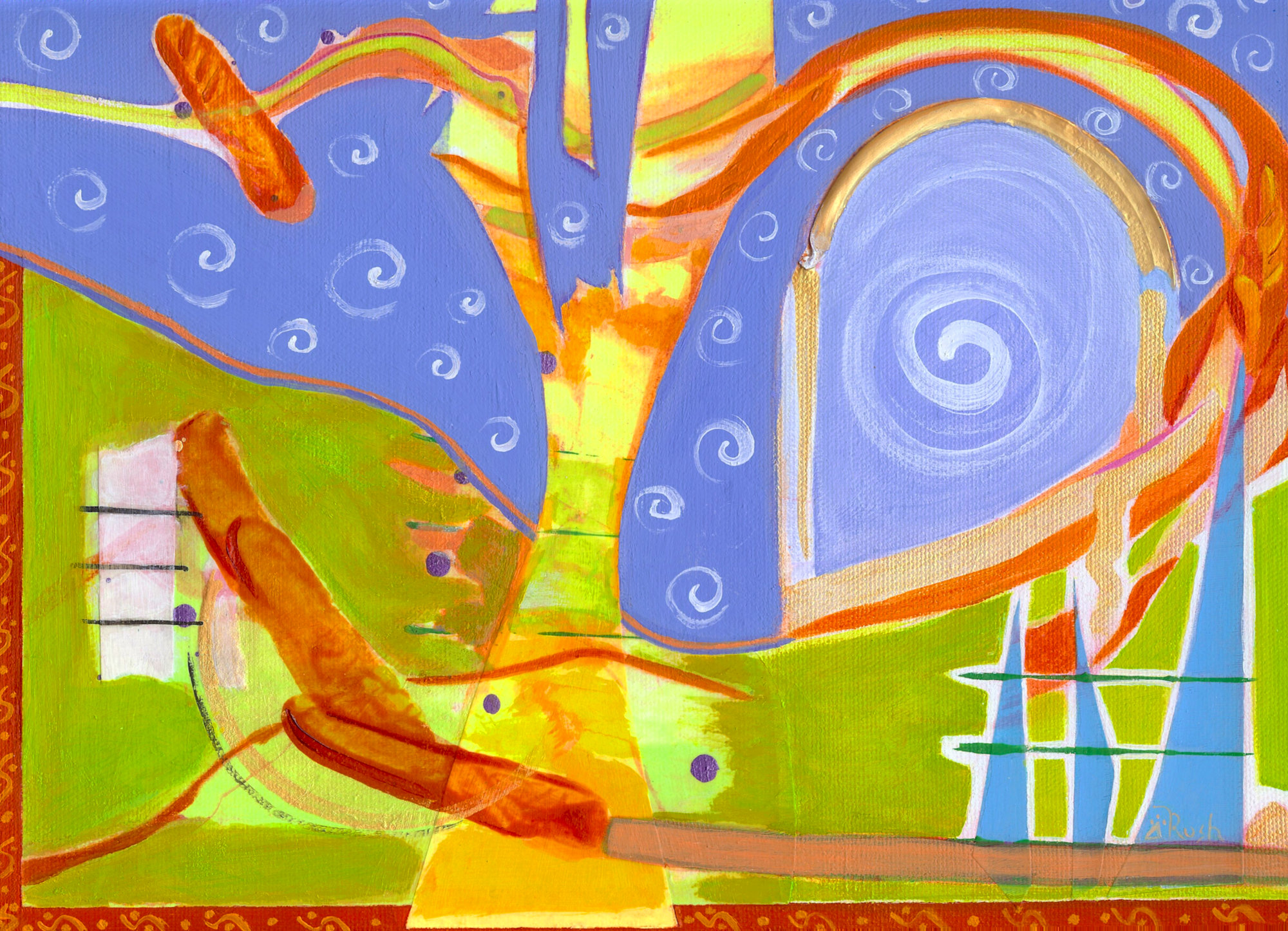 This first piece is unique to the other three in color story and design. It has a whimsical feeling to it. The style is Van Gogh-ish with the spiral sky.