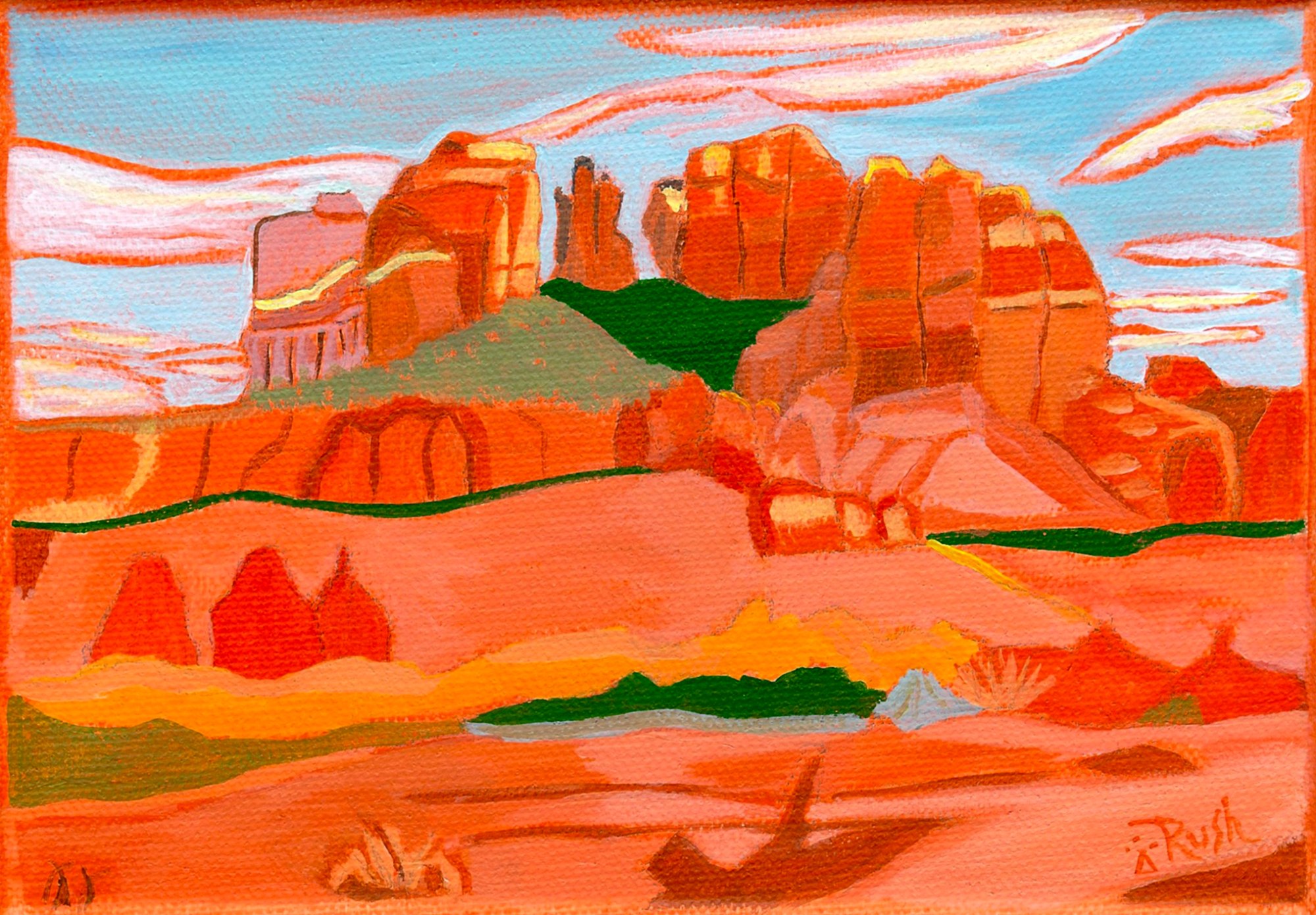 I painted this from a photograph I took at Cathedral Rock in Sedona as viewed from Secret Slickrock trail. The evening was magical, the fall foliage was still popping, and the weather was sublime.