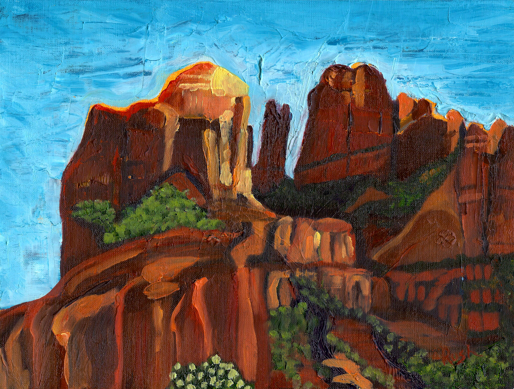 Explore the hidden treasures of Sedona, Arizona with Sedona Secrets. This 9 x 12 inch oil painting on paper captures the beauty of the Secret Slickrock Trail and Cathedral Rock. Perfect for plein air enthusiasts seeking a unique and exclusive piece for their collection.
