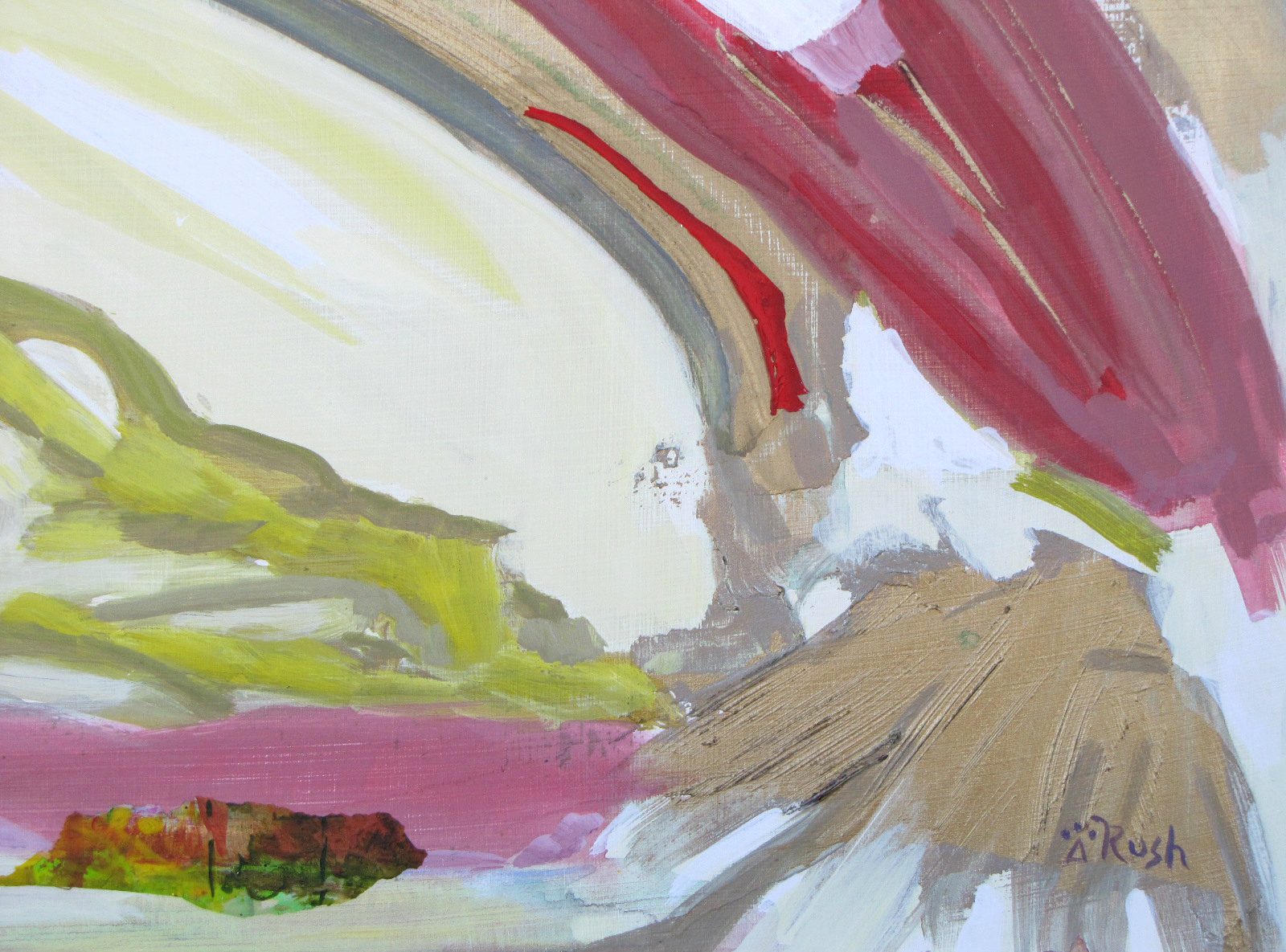 When the painting was complete, a piece of dried acrylic paint that I had pulled off the plastic lying under my painting and a piece of red dried acrylic paint sitting on the table both became part of the painting. They knew their place on it without me having to decide. Distinct from the painting itself, yet harmonious with the whole, they add panache to this otherwise peaceful scene.