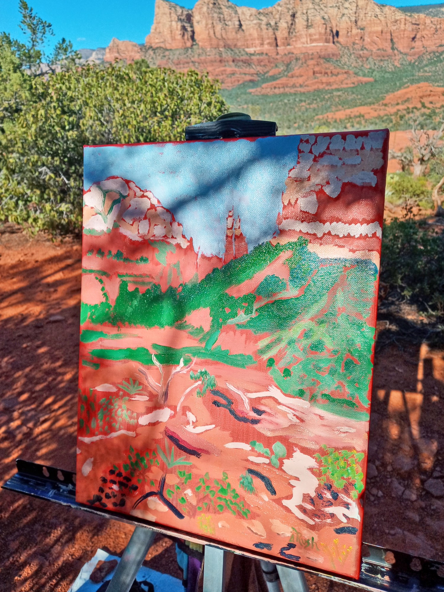 On Labor Day, I visited Sedona, Arizona to paint Plein Air. I hiked the Yavapai Vista Trail and found a perfect spot with plenty of shade. The view was amazing. I could see Rabbit Ears (center of composition), Courthouse Butte (right in the composition), and Munds Mountain (left in the composition.)