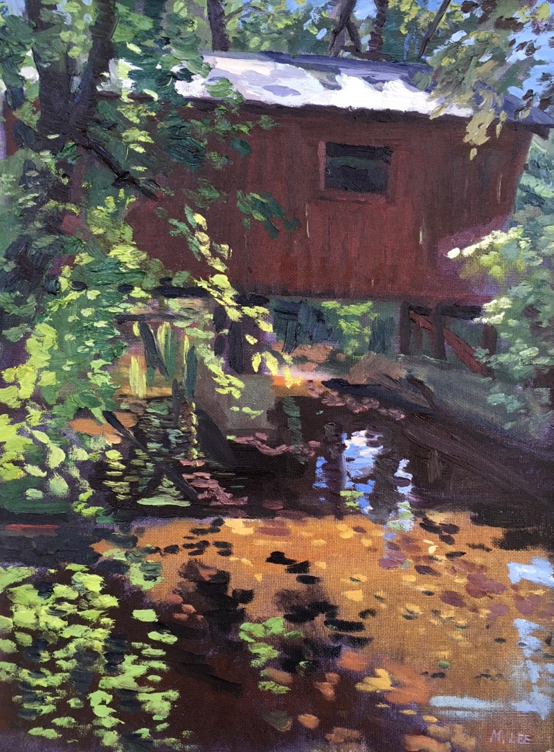 I found this covered bridge outside of Franklin, TN. It was locked up, so I went down into the creek below to paint it. I liked the glowing colors of the creek bed.
