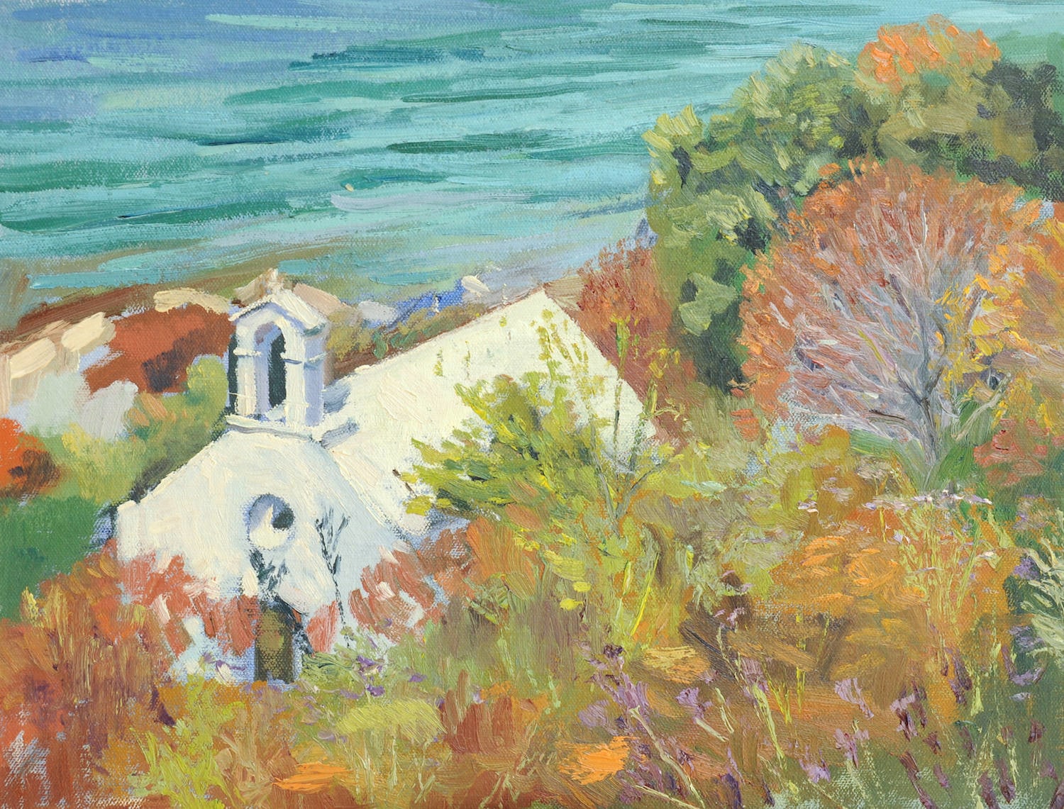 This chapel was nestled down in the hillside in a small town on Crete. I was visited by several goats while painting this picture- and later went swimming in the clear water. I love finding places like this that are off the beaten path.