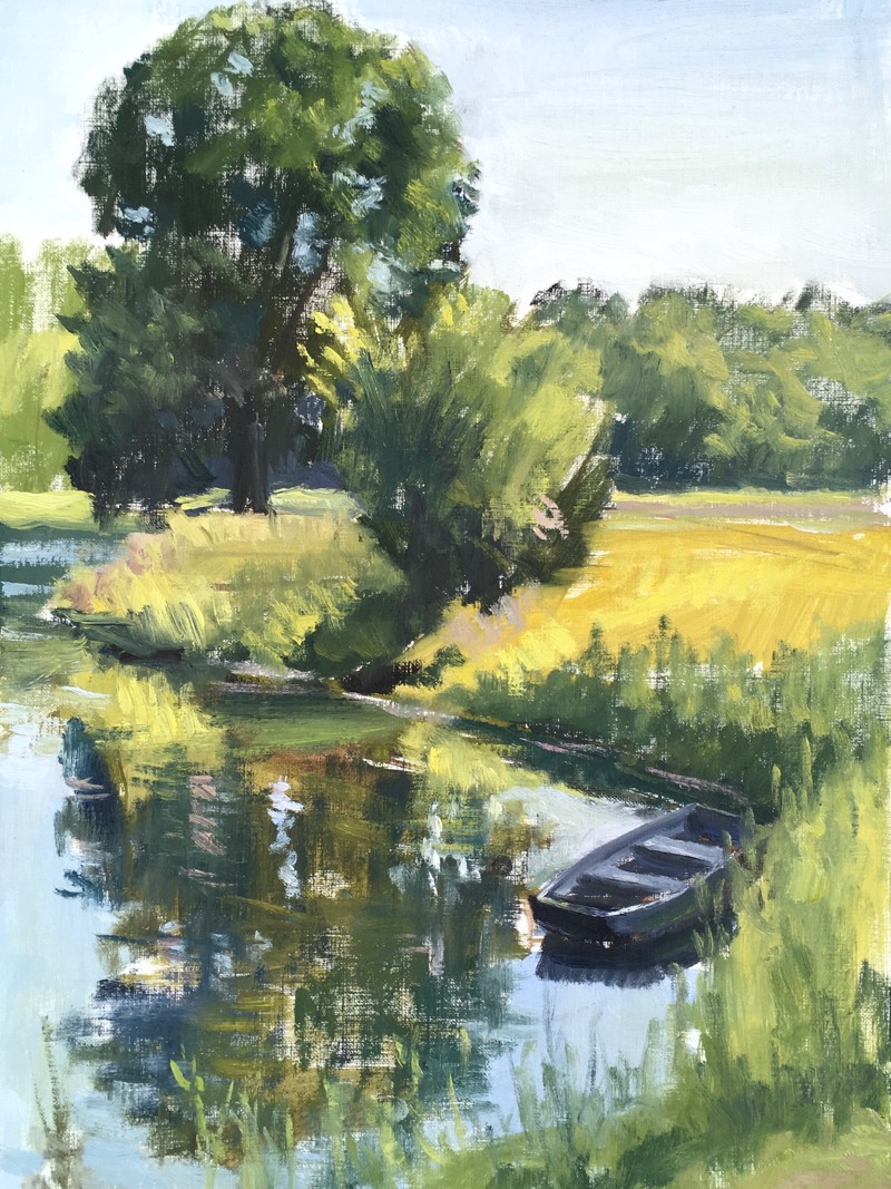 I liked this scene because the boat tells a bit of a story. It was tied up and kept moving around while I was painting this on location. I had to pick a point in time and capture it then.
