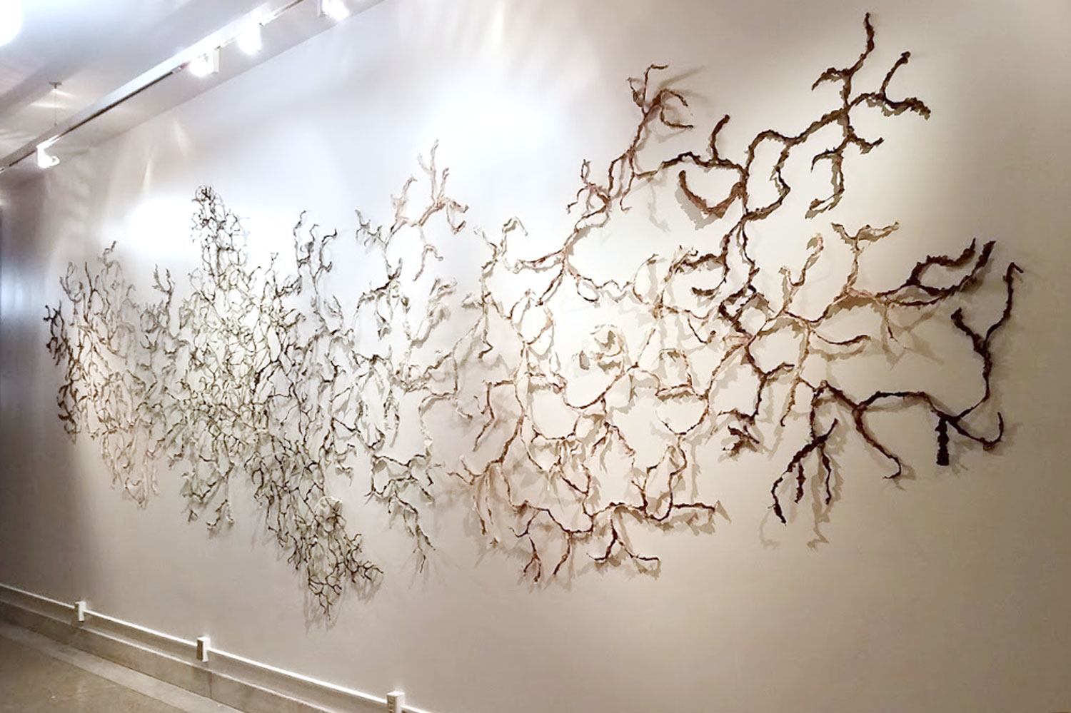 MessagePart of the exhibition, ReSeeding the City and an attendant community forum, created to expose and explore a range of responses to the often contending forces of people and plants in the urban setting. Ebb and Flow VII is made from handmade paper crafted of local waste plant fibers, expressing the changing nature of Providence’s rivers, by collaborating artists May Babcock and Megan Singleton. Newly created for this exhibition, this dramatic installation is a nearly 25-foot long wall relief of handmade paper pulp harvested from local plant fibers, Woonasquatucket River mud, and wild urban plants. It wends its way across the entrance wall, following the dendritic paths of the Woonasquatucket River’s watershed map. The accompanying cyanotype diptych, Ebb and Flow VII: After Anna, uses plant pressing of wild urban plants to create the photogram silhouette. Over 40 species were documented along the road by the artist’s Providence studio.