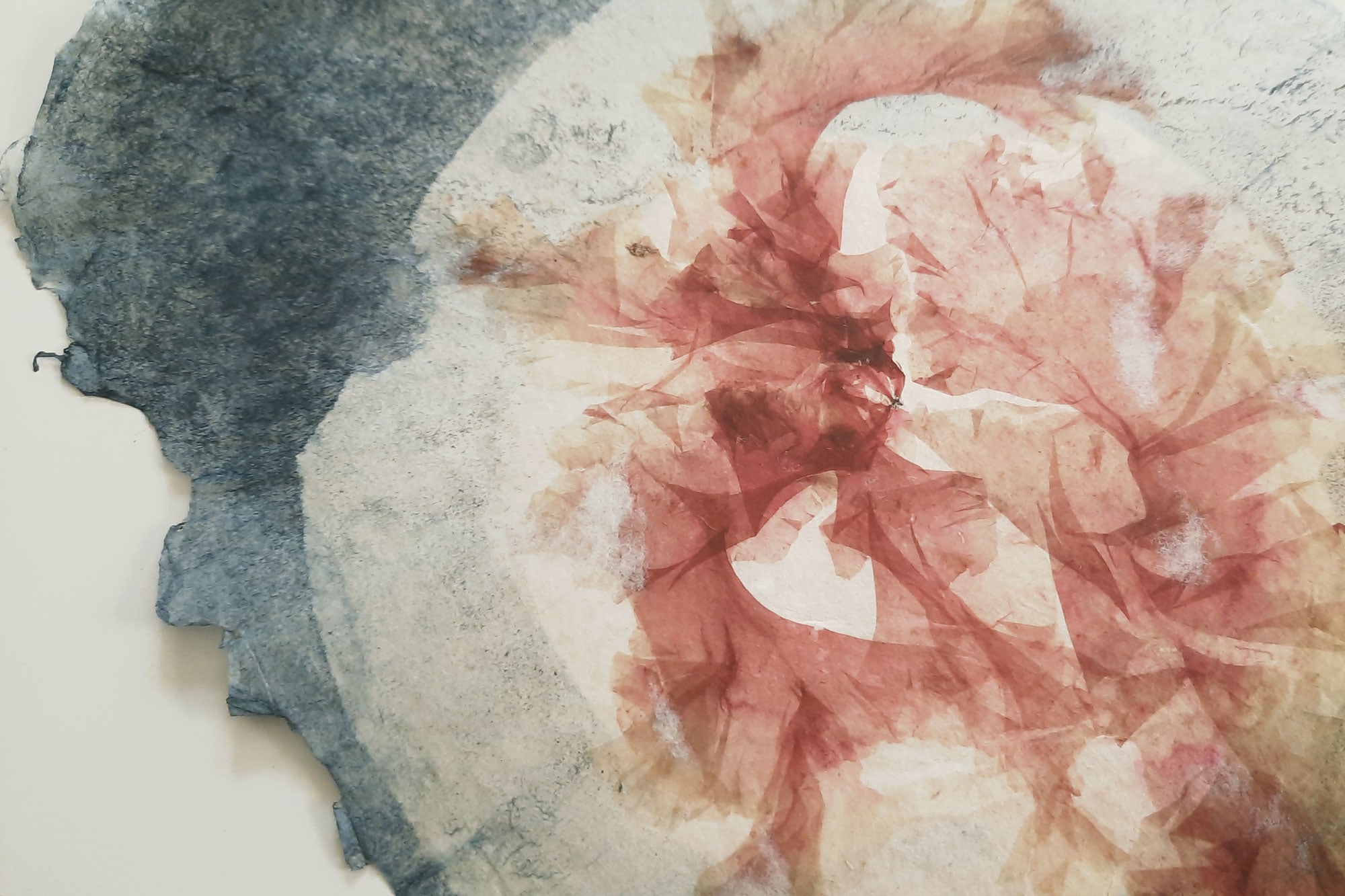 Foraged seaweeds are embedded in paper pulp by the artist during the wet hand papermaking process. Seaweed and pulp are pressed and dried together, resulting in an extraordinarily detailed preservation of the aquatic species. Ocean flora is layered inside a natural, organic, tactile, imperfect, translucent handmade paper complete with feathery 'deckled edges.' Then, handmade indigo ink is added in several layers to evoke the artists' experience of discovery of seaweed species in the sea.