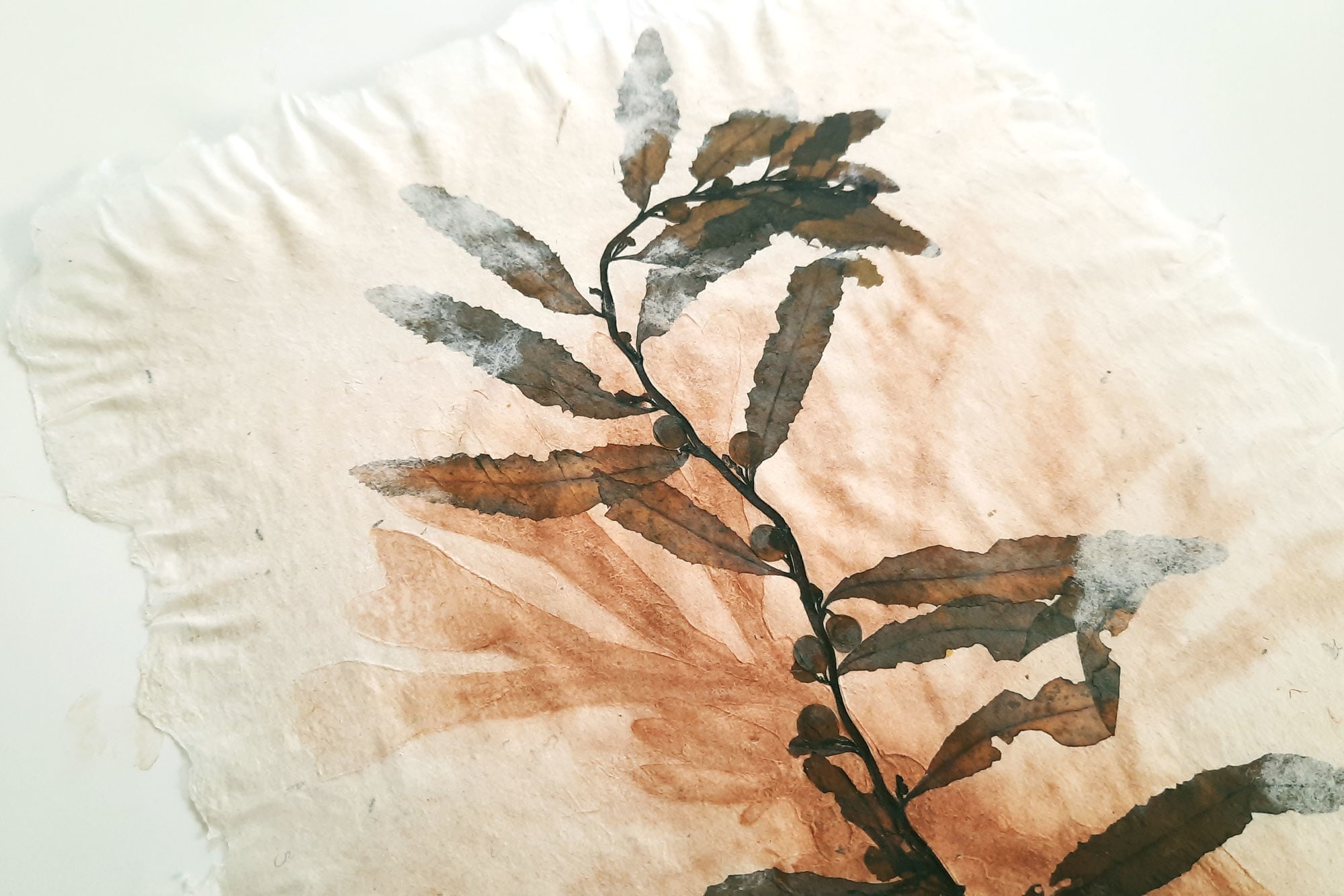 Foraged seaweeds are embedded in paper pulp by the artist during the wet hand papermaking process, and bladderwrack seaweed is layered on top to impart its natural colors and shapes onto the paper. Seaweed and pulp are pressed and dried together, resulting in an extraordinarily detailed preservation of the aquatic species and subtle eco-print of the bladderwrack. Ocean flora is layered inside a natural, organic, tactile, imperfect, translucent handmade paper complete with feathery 'deckled edges.'