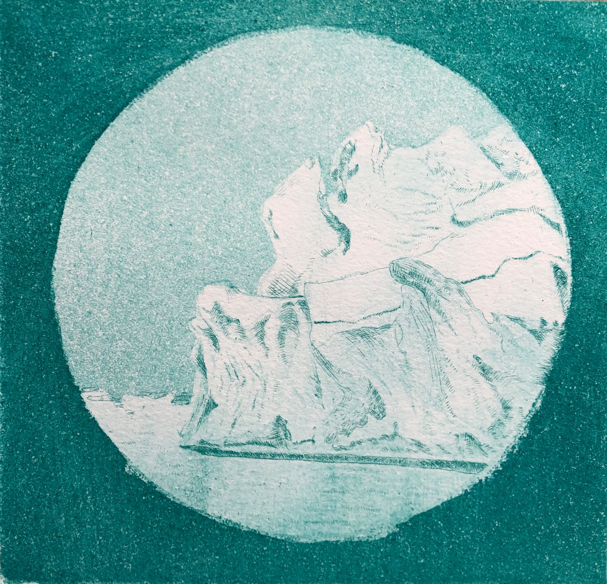 These small 6x6" etchings are a personal response to spending most of my time in Greenland glued to binoculars. These images show close ups of icebergs, recreating my experience of sailing along with binoculars in hand.