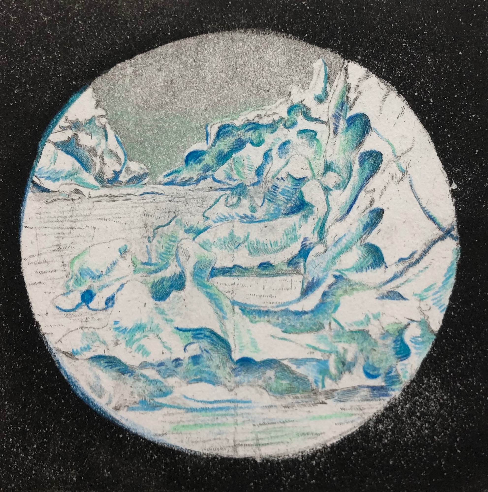 These 6x6" etchings are a personal response to spending most of my time on an artist residency in Greenland glued to binoculars. These images show close ups of icebergs, recreating my experience of sailing along with binoculars in hand. The colored pencil details are unique on the individual prints.