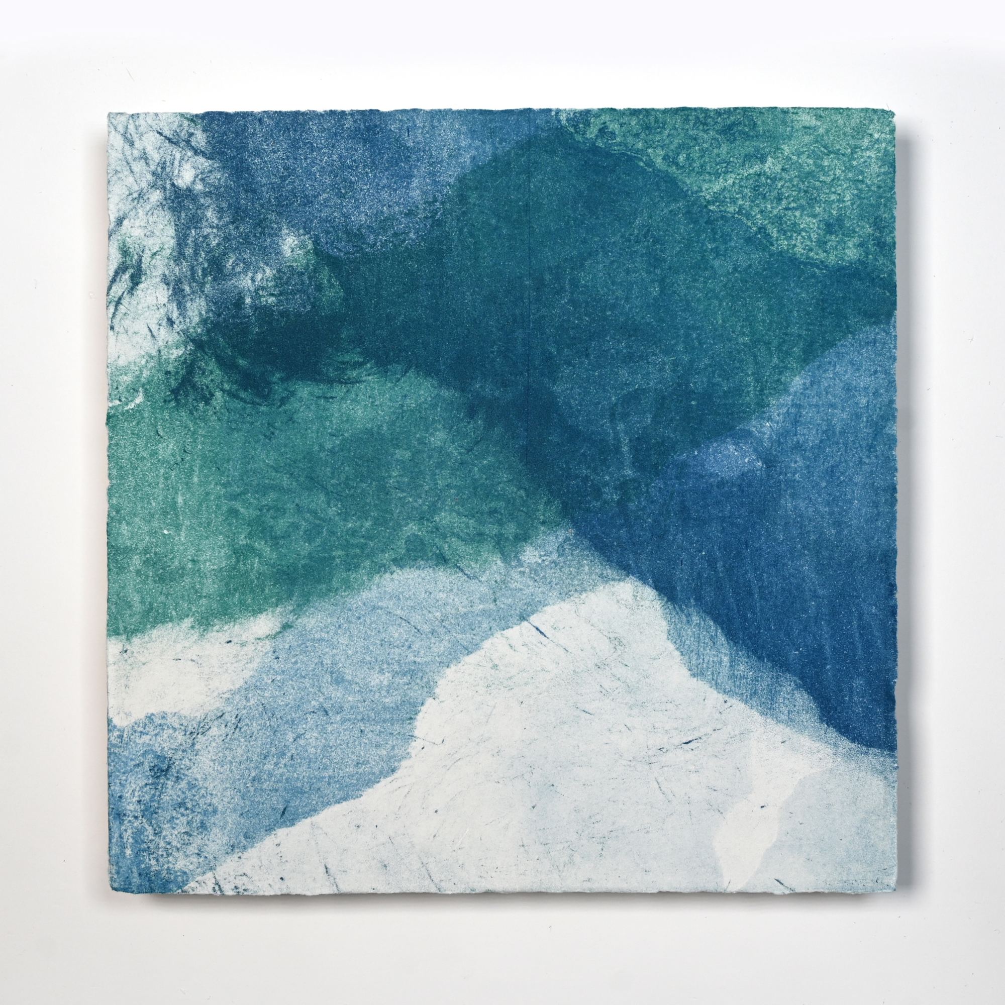 A series of experimental etchings evoking atmospheric Arctic seascapes. These pieces were made in memory of ice watches during the MaréMotrice artist residency in Greenland, sailing through foggy fjords. They function like a brilliant, shapeshifting, reveal through the fog and play with Arctic mirages and cause tricks of the eye. There are moments of clear detail and sublime wonder amidst fragmentation. Two etching plates were printed over each other multiple times in different orientations to create new and abstracted imagery. Stencils made of torn newsprint were used to block ink during the printing process, creating the white shapes throughout the works. The stencils were continually torn apart and reused throughout the series so that the stencil shapes become self-referential but are constantly transforming and deteriorating. Mounted on a cradled wooden panel.