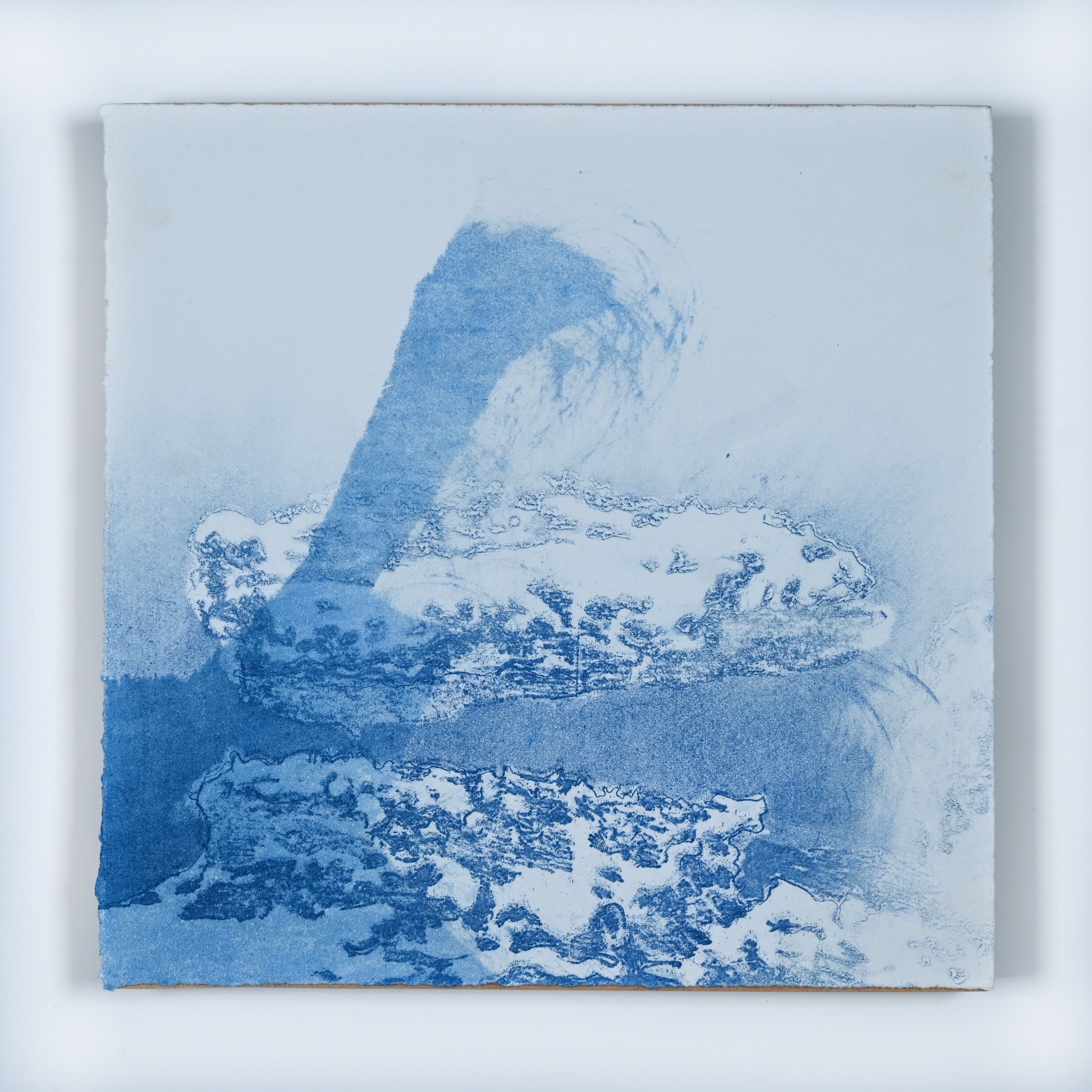 A series of experimental etchings evoking atmospheric Arctic seascapes. These pieces were made in memory of ice watches during the MaréMotrice artist residency in Greenland, sailing through foggy fjords. They function like a brilliant, shapeshifting, reveal through the fog and play with Arctic mirages and cause tricks of the eye. There are moments of clear detail and sublime wonder amidst fragmentation. Two etching plates were printed over each other multiple times in different orientations to create new and abstracted imagery. Stencils made of torn newsprint were used to block ink during the printing process, creating the white shapes throughout the works. The stencils were continually torn apart and reused throughout the series so that the stencil shapes become self-referential but are constantly transforming and deteriorating.