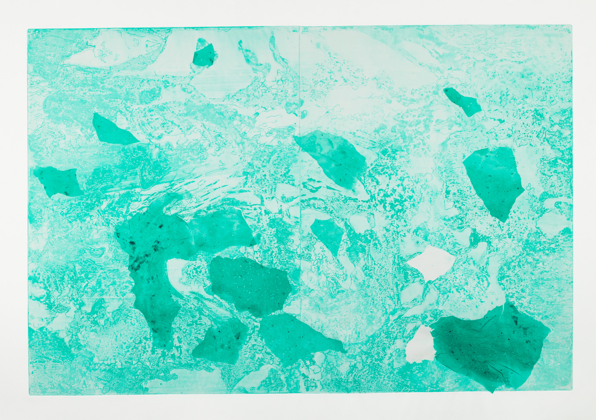 This large-scale sugarlift aquatint etching is made in the image of a fjord in Svalbard, Norway full of brash ice (the final stage of melting icebergs). The fields of aquamarine color are overbeaten abaca paper pours made by paper/ceramic artist Anela Ming-Yue Oh that are bonded with the etching paper without using glue.