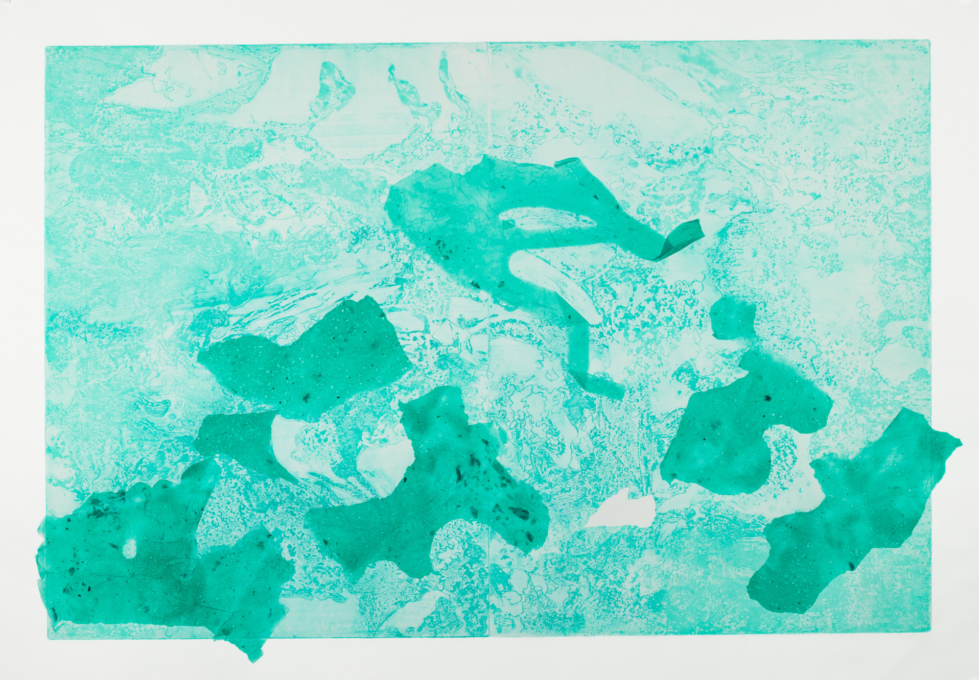 This large-scale sugarlift aquatint etching is made in the image of a fjord in Svalbard, Norway full of brash ice (the final stage of melting icebergs). The fields of aquamarine color are overbeaten abaca paper pours made by paper/ceramic artist Anela Ming-Yue Oh that are bonded with the etching paper without using glue.