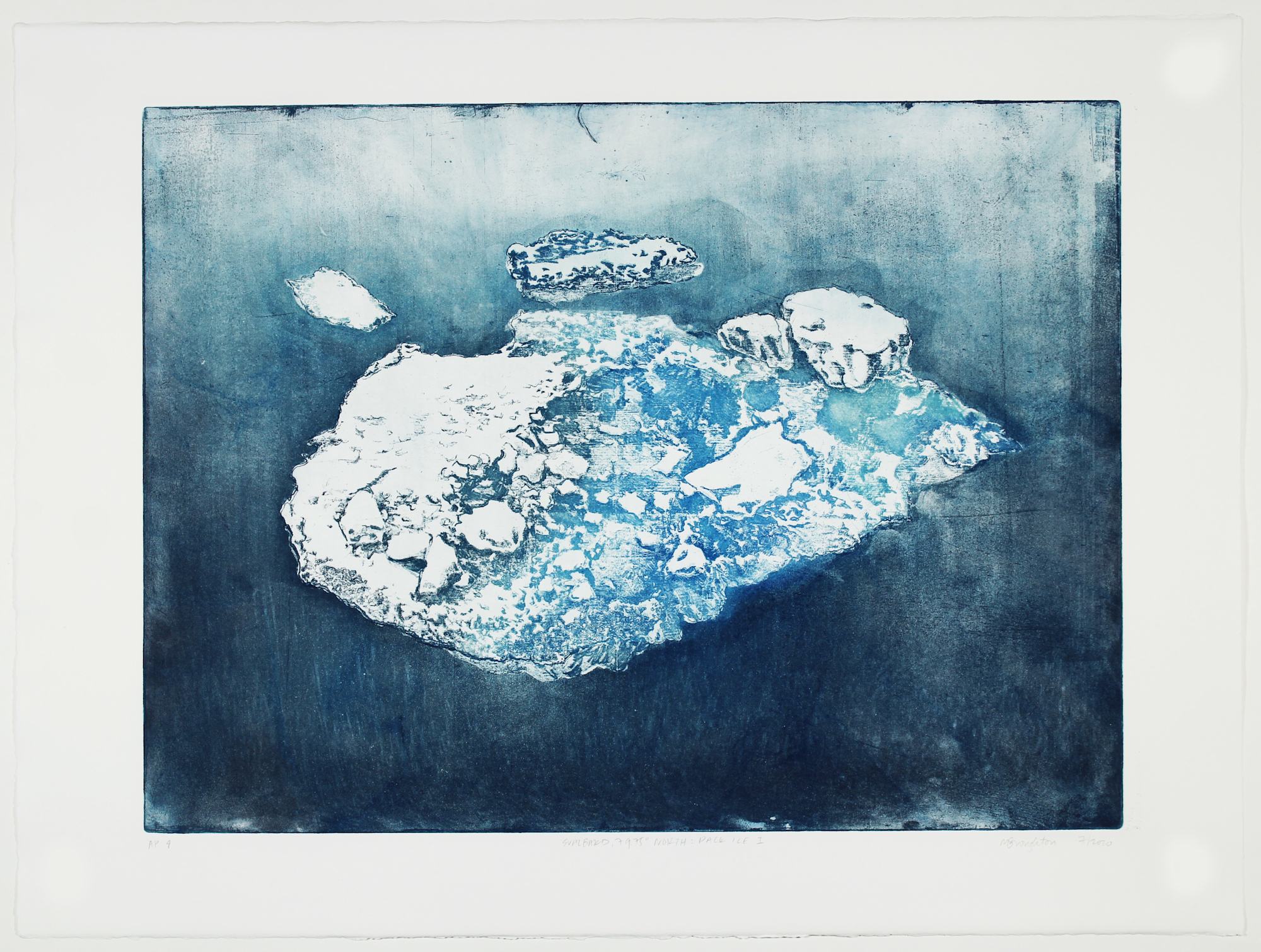 This series precedes Pack Ice II and represents another aspect of the experience of being locked in pack ice in June 2019 while on The Arctic Circle Residency. "Pack Ice I" depicts an isolated section of open pack ice, and its copperplate remains intact as an elegiac image unlike the methodical destruction at the heart of "Pack Ice II."