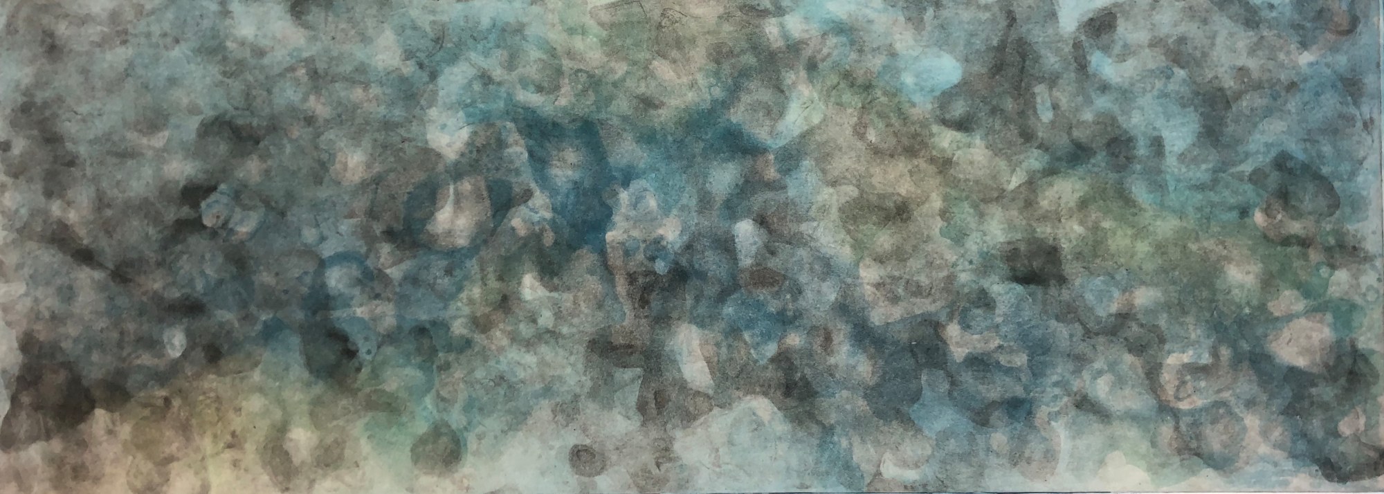 Created using melting ice cubes and ferric chloride, this panoramic work (Recherchebreen Glacial Lagoon) is a nod to the still, slowly drifting, smoothly sculpted ice on the shores of an Arctic glacier's muddy lagoon. This series features two plates printed over each other and was created prior to destroying the plates in ferric chloride (after which, the small and large Variable Editions of Recherchebreen were created)