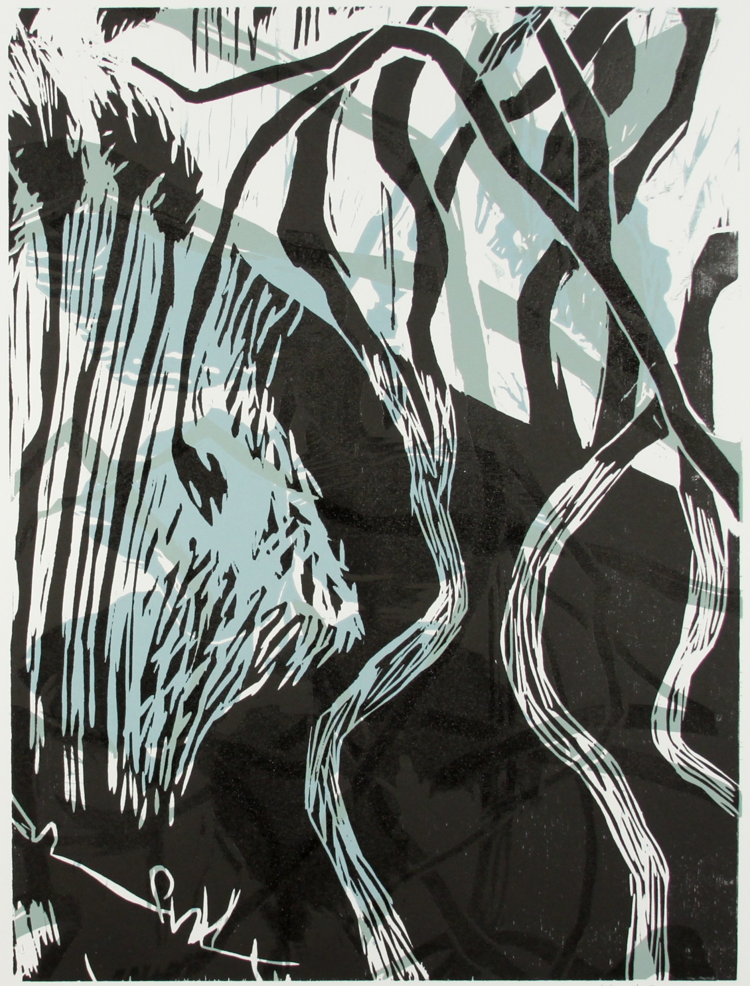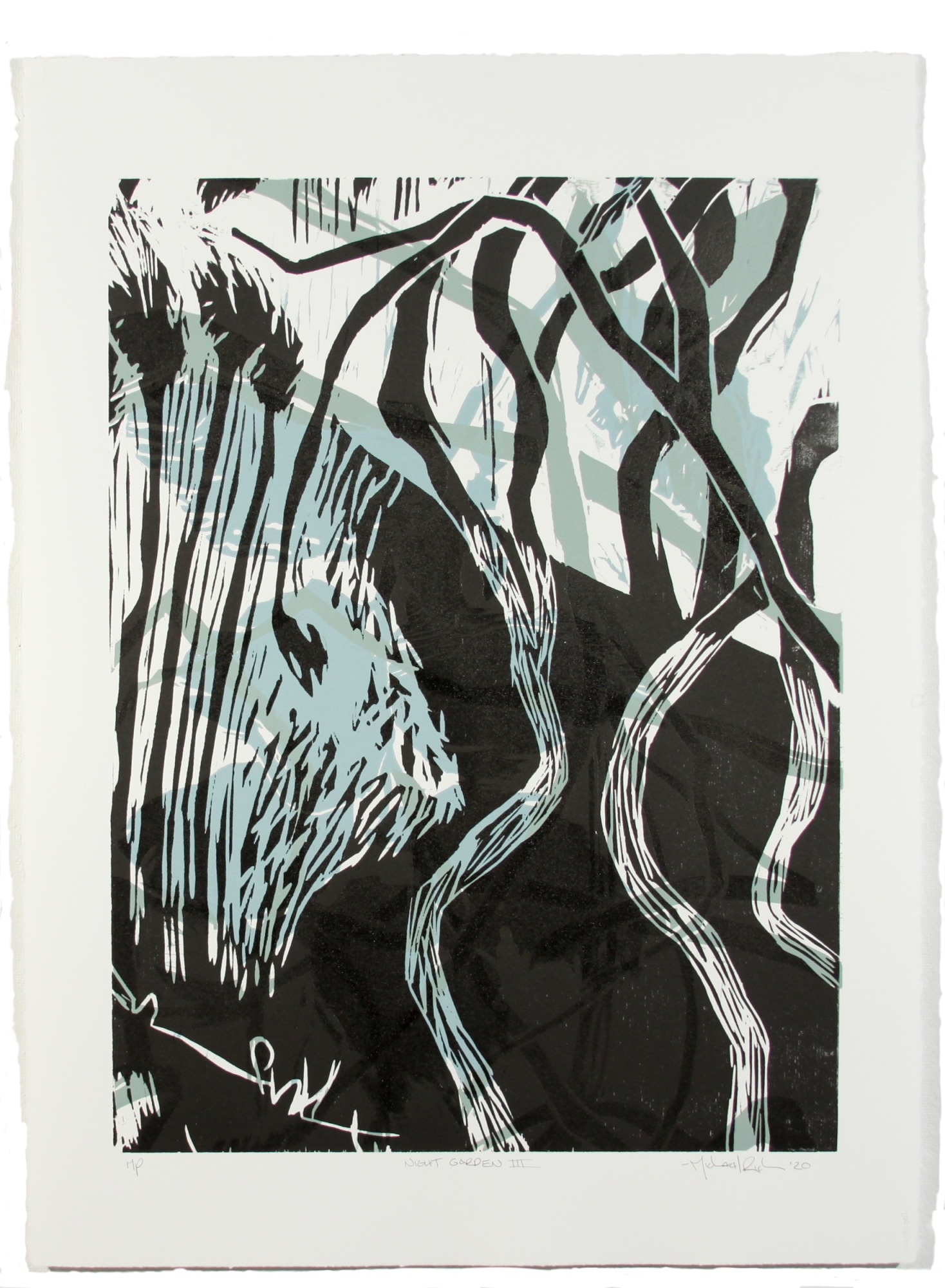 Night Garden is a series of unique, woodcut monoprints based on the flowers and trees of my surrounding gardens. Each print is made using multiple plates in 2 or 3 colors. The graphic sensibilities of the prints are very different from the feel of the paintings with strong contrast of light and dark, adding to their mystery.