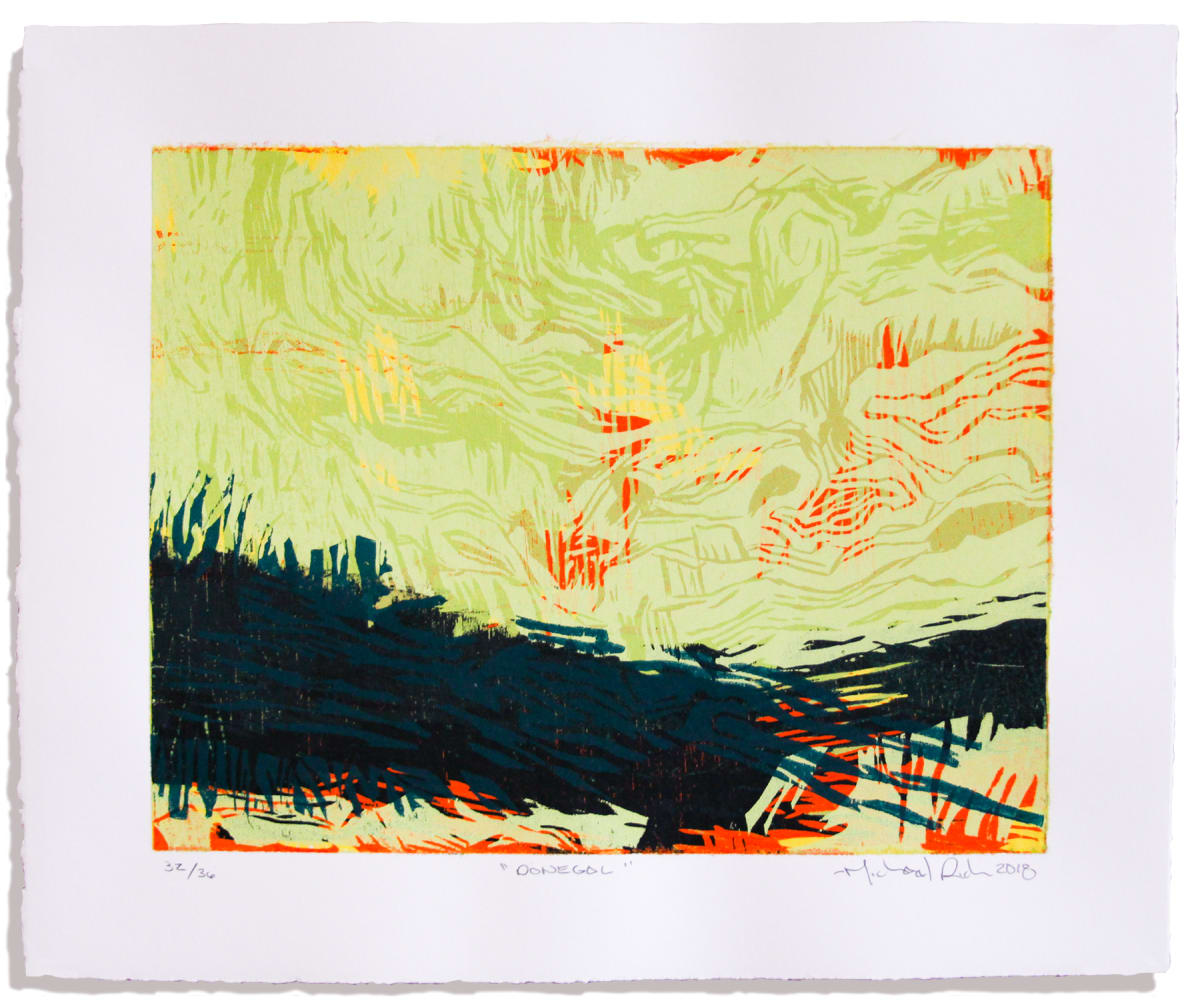Donegal is an edition of woodcuts with only 36 prints made. It is a 7 layer woodcut printed by hand on mullberry paper, mounted to Rives BFK. The image measures 11 x 14 inches, and the paper size is 15 x 18 inches. Available unframed.