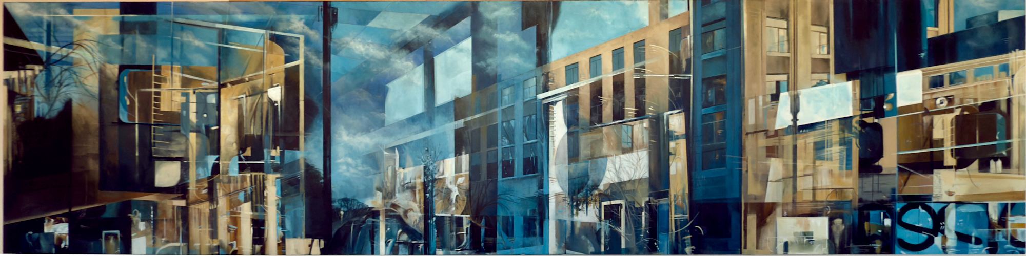 This panoramic cityscape explores the layering of urban reflections, distorting reality through glass and architecture. The composition weaves together multiple perspectives, where solid structures dissolve into fragmented light and shadow. Subtle traces of movement and history linger within the reflections, inviting contemplation on the passage of time in the built environment. Stillness and complexity merge, creating a meditative scene that encourages viewers to pause and engage with the intricate interplay of forms and surfaces.