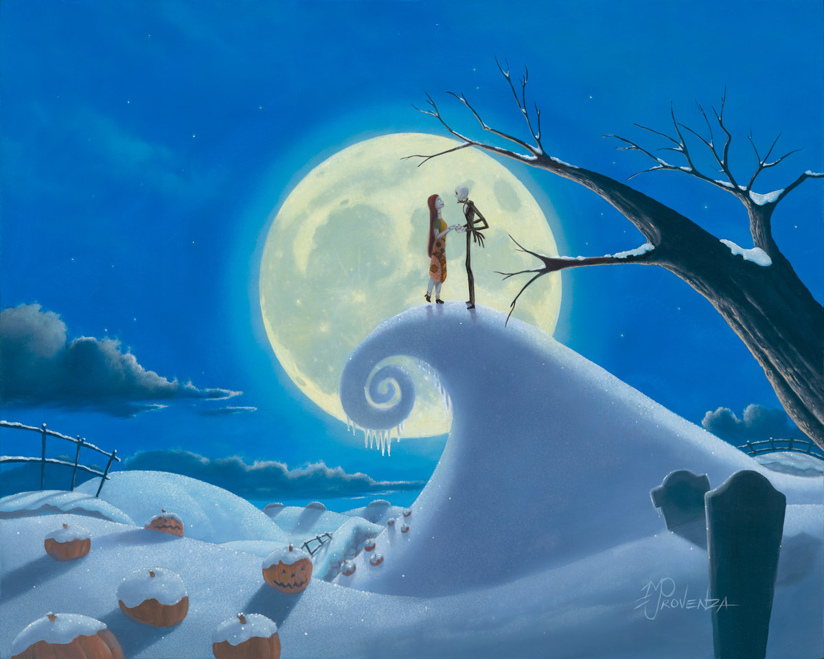 “Jack and Sally are enjoying each other’s company on this crisp snow covered hill under the romantic moonlit sky.”