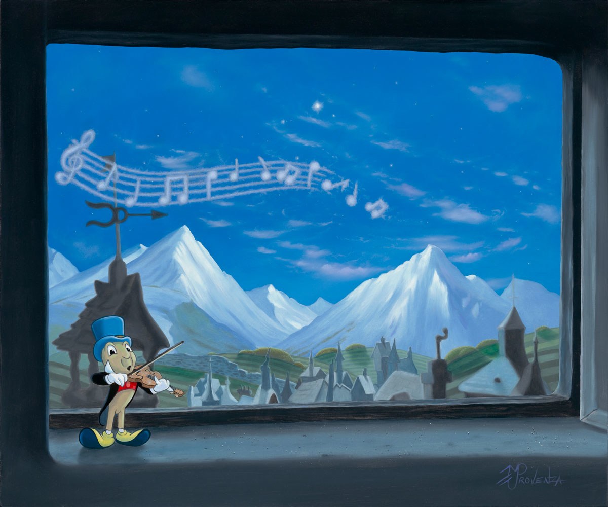 “Jiminy Cricket hops on the window sill and starts playing and singing When You Wish Upon a Star. Now we all sing along and believe.”
