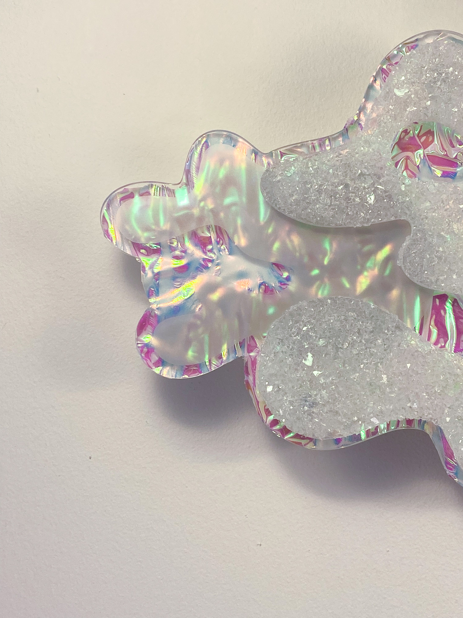 A variety of reflective and shimmery materials cause the colours in these pieces to shift depending on the angle of view, hang height and the lighting in a space. It is recommended that these pieces be viewed in person to experience the shift in colour as you walk around them.