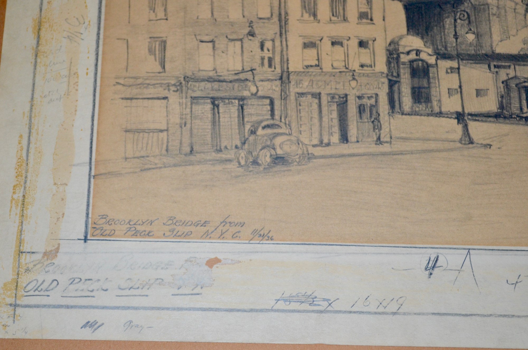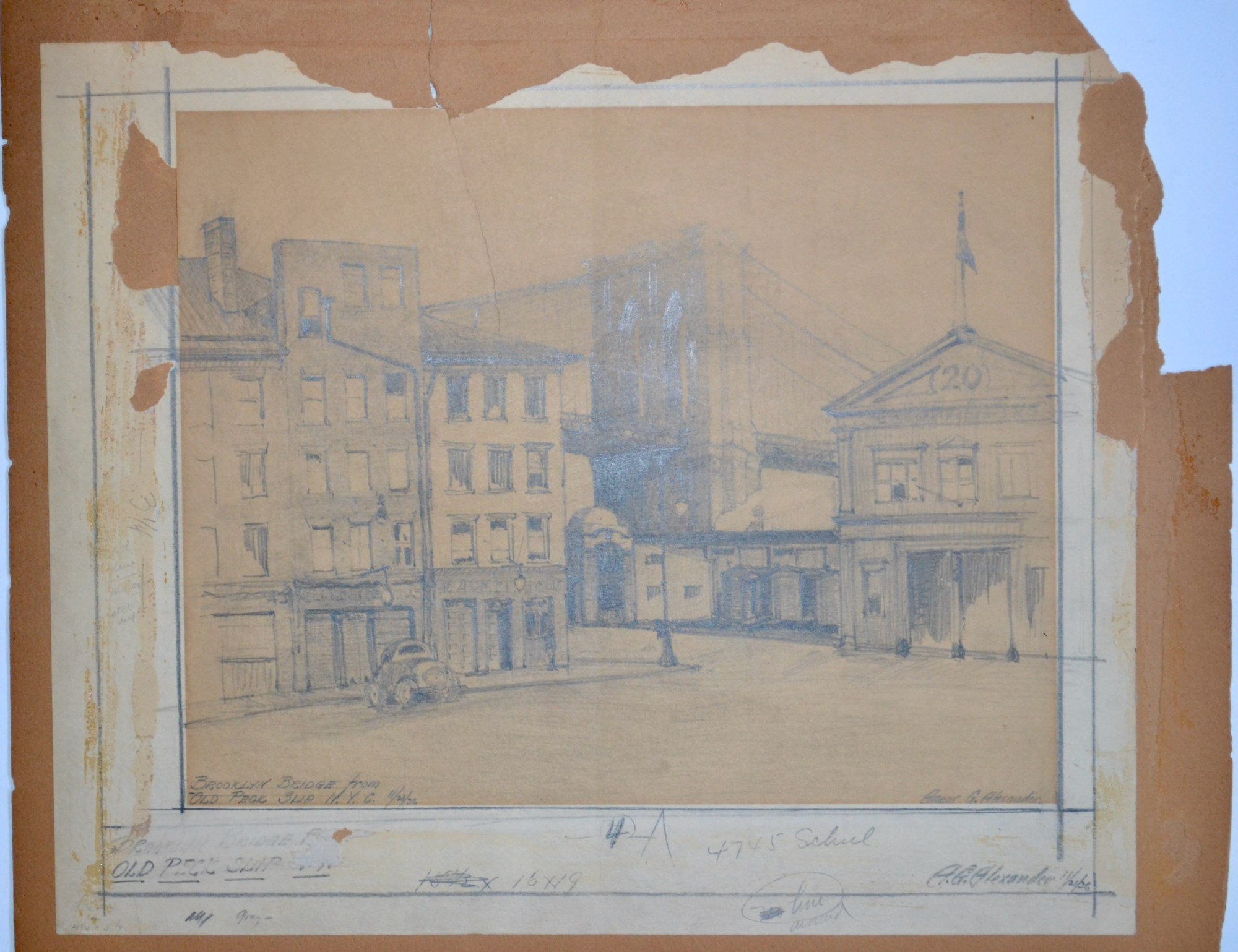 - Signature: Signed in pencil "Aaron G. Alexander" within image lower right-hand corner. Titled and dated in pencil "Brooklyn Bridger from Old Peck Slip N.Y.C. 11/21/36" within image lower left-hand corner. Signed and dated in pencil "A. G. Alexander 11/21/36" extreme lower right-hand corner. Titled in pencil "Brooklyn Bridger from Old Peck Slip N.Y.C." extreme lower left-hand corner. Multiple measurements and notes from framer all around the image.