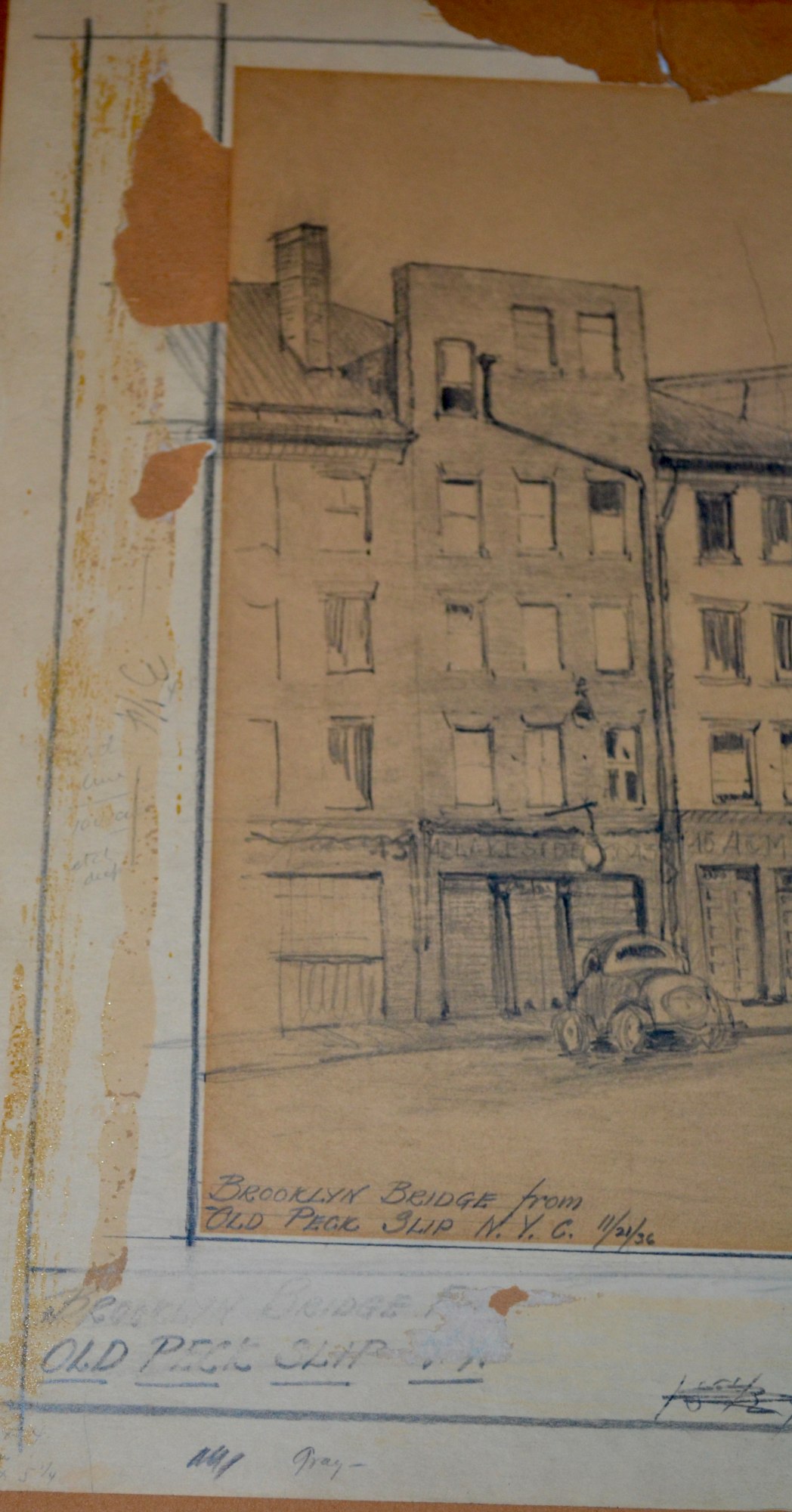 Nice pencil sketch of part of the Brooklyn Bridge from Old Peck slip in the mid-1930's. While the image is nice and well done, it has been hard used due to the original process of framing the sketch. Glue was used liberally to glue the print to its backing and then it was glued to the mat and then framed. The image itself is largely unaffected by all of this but is still in rough shape.