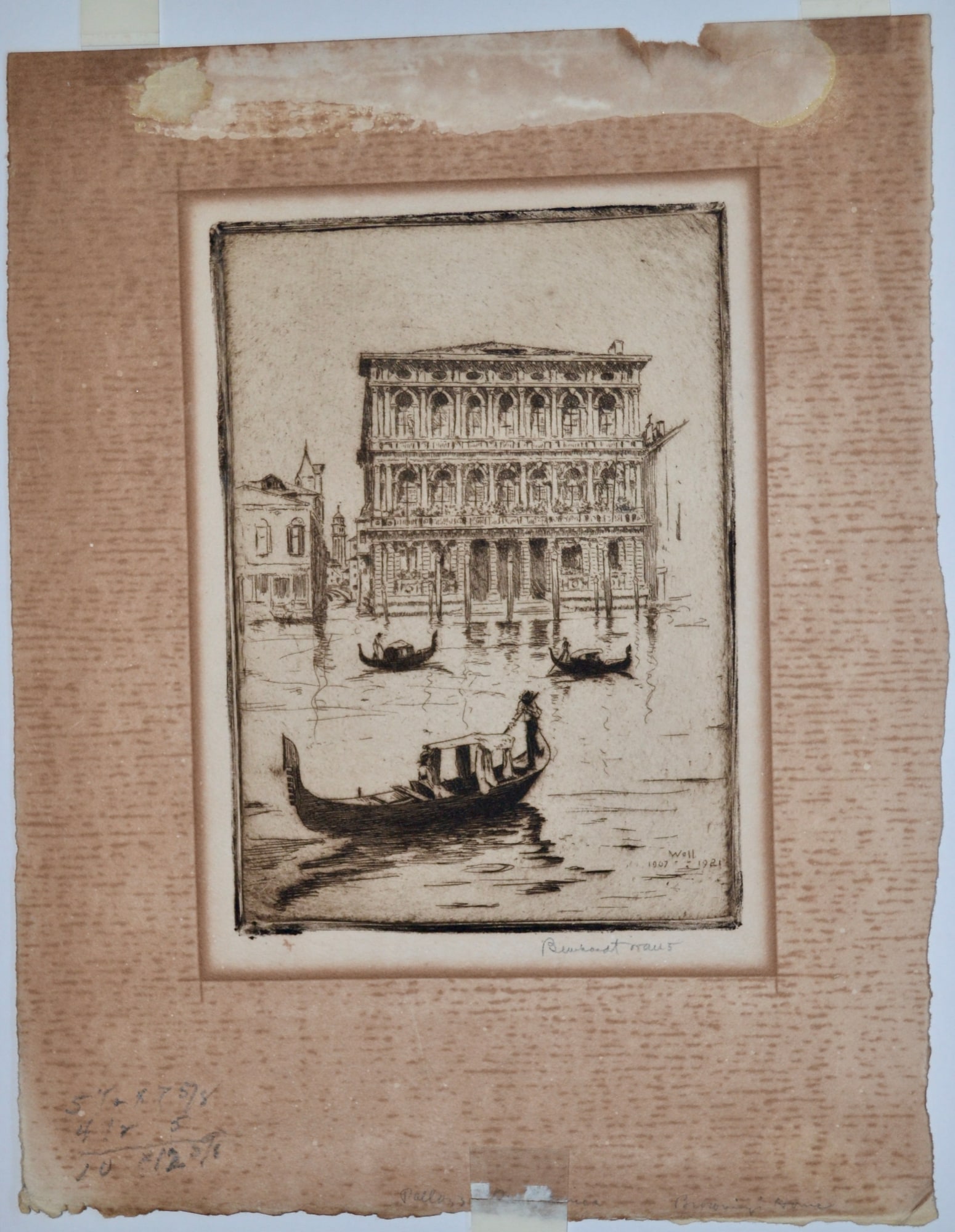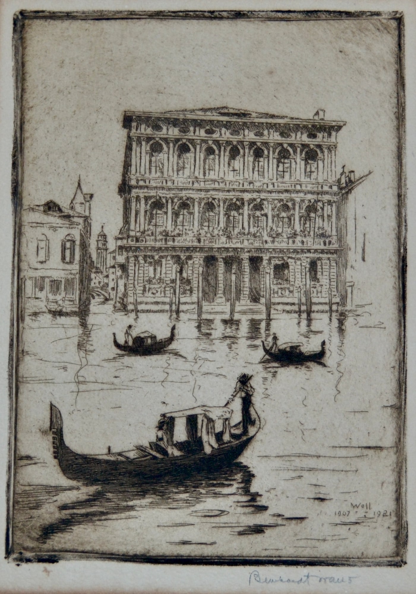 Etching in dark brown ink of Browning's Home, Venice, Italy.